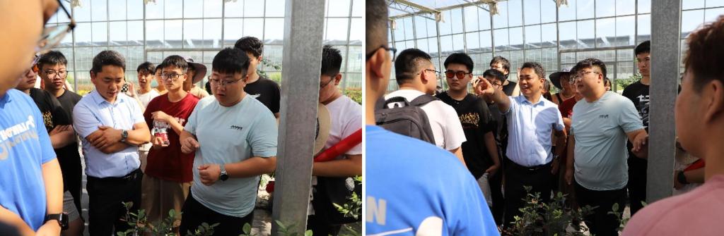 首先,在指导老师的带领下,同学们参观了晋中国家农高区设施农业示范基地。通过参观智能玻璃温室内的全基质设施化蓝莓栽培、智能室温内部设施及水肥一体化设施设备等,同学们不仅了解到蓝莓的栽培、生长周期等,更近距离观察到智慧化大棚对于温度、湿度等生长条件的一体化自动控制系统,直观感受到智慧农业信息技术和现代化高效的农业设施设备在农业领域中的应用。