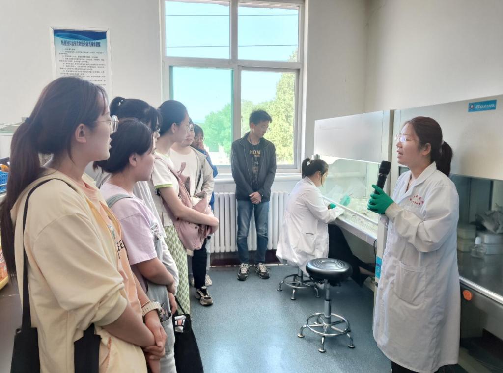 在实验室,杜晓芬老师介绍了谷子分子育种现状及发展趋势,讲解了实验室操作流程、实验室安全事项及分子团队相关实验内容、方法并为同学们答疑解难。李颜方老师结合目前实验内容及实验材料,讲解遗传转化的原理、方法、流程。成锴老师介绍了品质分析仪器设备的相关功能、原理、使用方法,重点对表型测定中如何避免人为误差作了详细讲述。通过各位老师的讲解使学生对分子育种体系有了更深入的了解。研究所室内建有玻璃温室、试验操作室、种质材料库、挂藏室、移动旱棚、网室、农机具库、场棚、种子晒场以及田间灌溉设备和试验田围栏等科研设施条件。参观过程中,老师们向学生介绍了高标准的分子标记、基因转化、组织培养、化学分析、色谱分析等实验室,以及其中配备的科研仪器设备的主要用途。