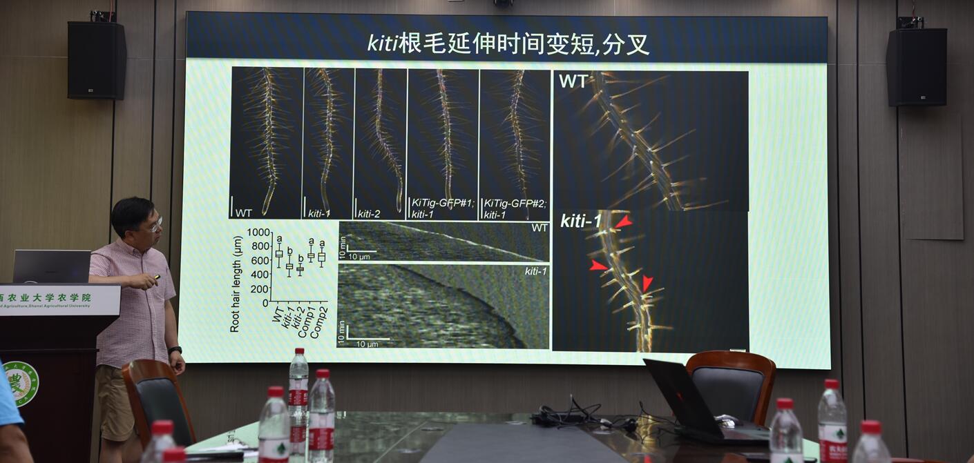 其次,李厦教授为我们做了题为“一条转录-磷酸化途径调控根毛生长”的学术报告。李厦教授在报告中讲述到根毛对于植物生长的重要作用,他们团队发现一个bHLH转录因子RSL4可以激活下游基因ERULUS,KiTi和RBOHC的转录,而且ERULUS和KiTi相互作用,ERULUS可以磷酸化KiTi,并且KiTi通过磷酸化RBOHC调控根毛细胞的ROS稳态,进而调控根毛生长。该报告为研究根毛生长的调控机理提供了新线索和理论参考。