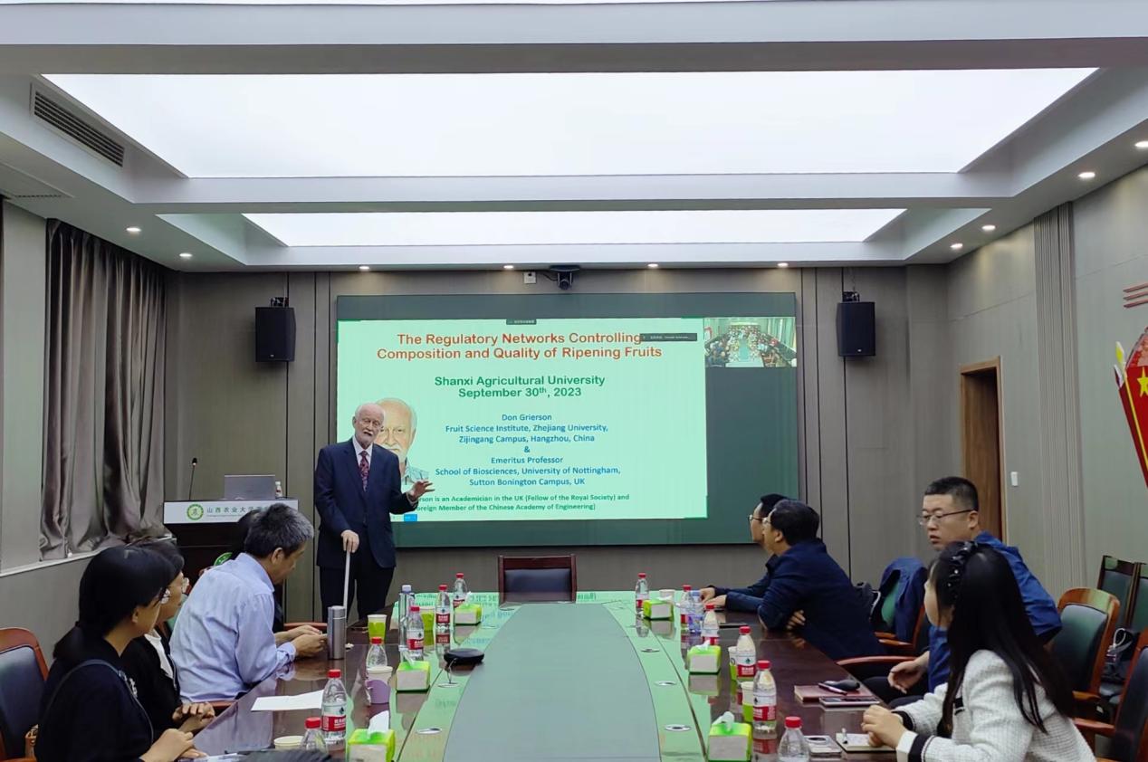 9月30日下午,英国皇家科学院院士,中国工程院外籍院士,英国诺丁汉大学教授,山西农业大学特聘教授Donald Grierson来我校开展学术交流。报告在安博官网体育主楼210学术会议室及腾讯线上会议室同时进行,孔照胜副校长、原向阳院长对Grierson教授的到来表示热烈欢迎,对他多年来对山西农业大学的关注与支持表示感谢。会议由韩渊怀教授主持,安博官网体育、生命科学学院、果树研究所的部分师生参加了此次学术交流。