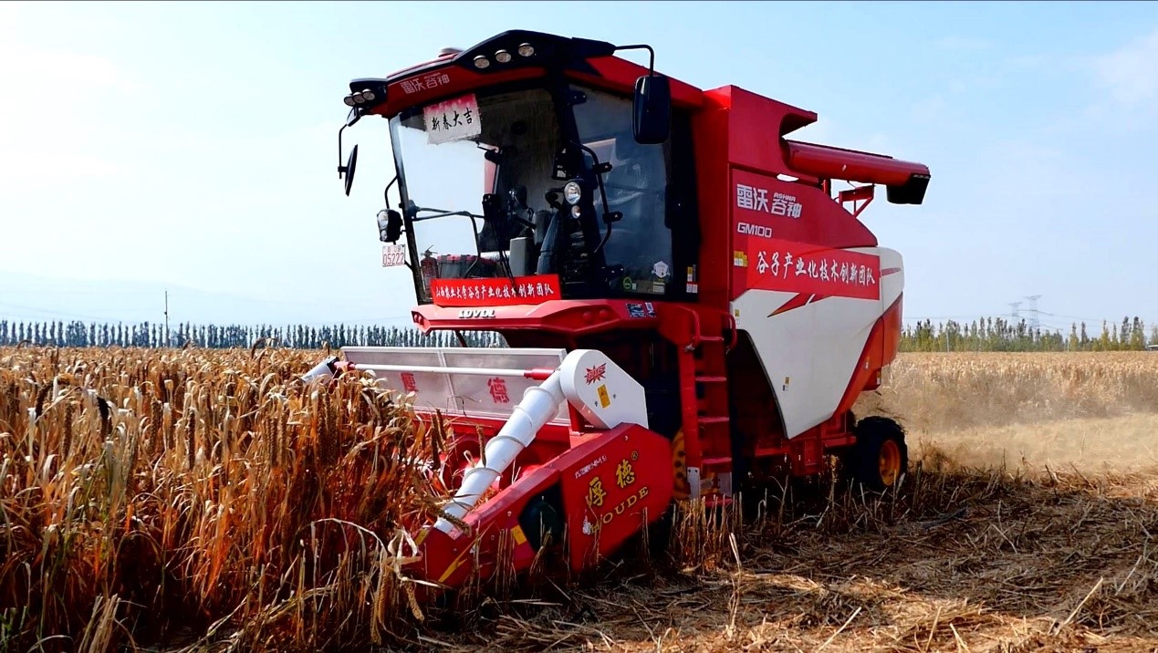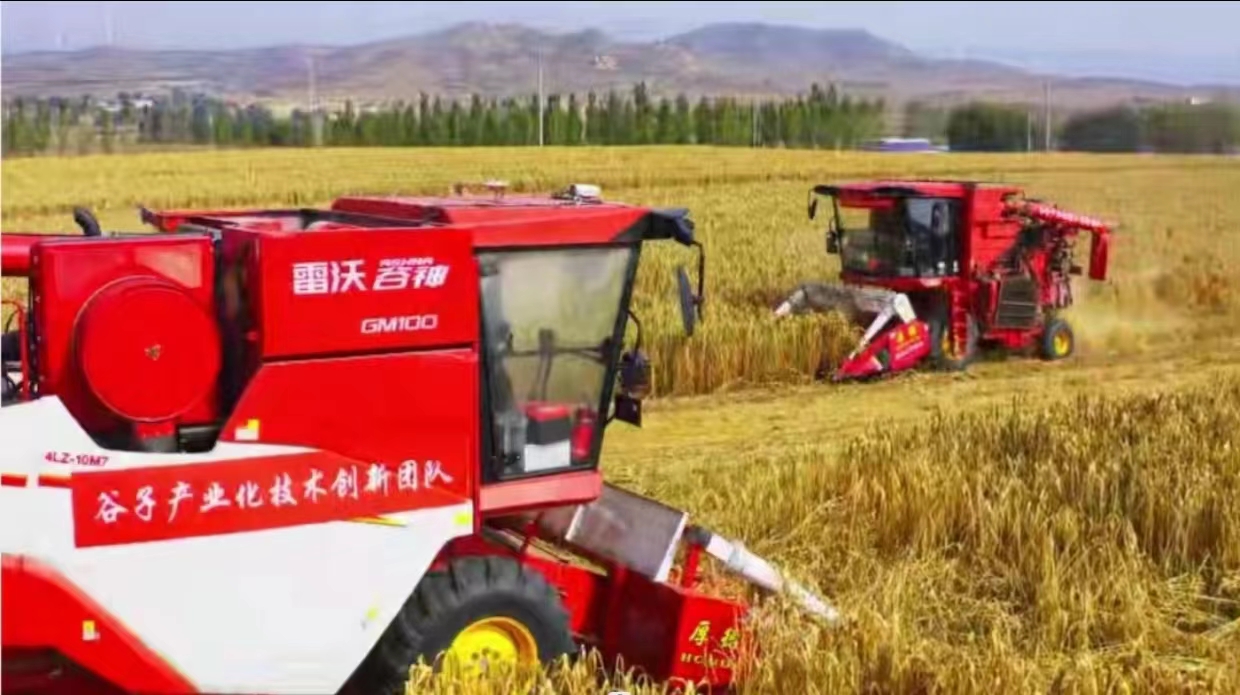 在收获现场,专家们首先对山西农业大学谷子创新团队、山西省谷子产业技术体系联合联适导航和潍柴雷沃共同研发2台谷子智能化联合收获机作业现场进行观摩。谷子智能化联合收割机搭载了割台高度、喂入速度、滚筒转速和清选风速等多组传感器和北斗卫星导航定位系统,初步实现了谷子智能收获作业。专家远程启动谷子联合收割机开始作业,两台智能谷子联合收获机在北斗无人驾驶控制系统的控制下,分别按照“回”字型和“鱼尾”型2种既定线路开进田间,精准地进行收获作业,自动进行割台升降、行走收割、转弯掉头,收获机粮仓装满后,行驶至指定地点,可实现远程遥控卸粮。