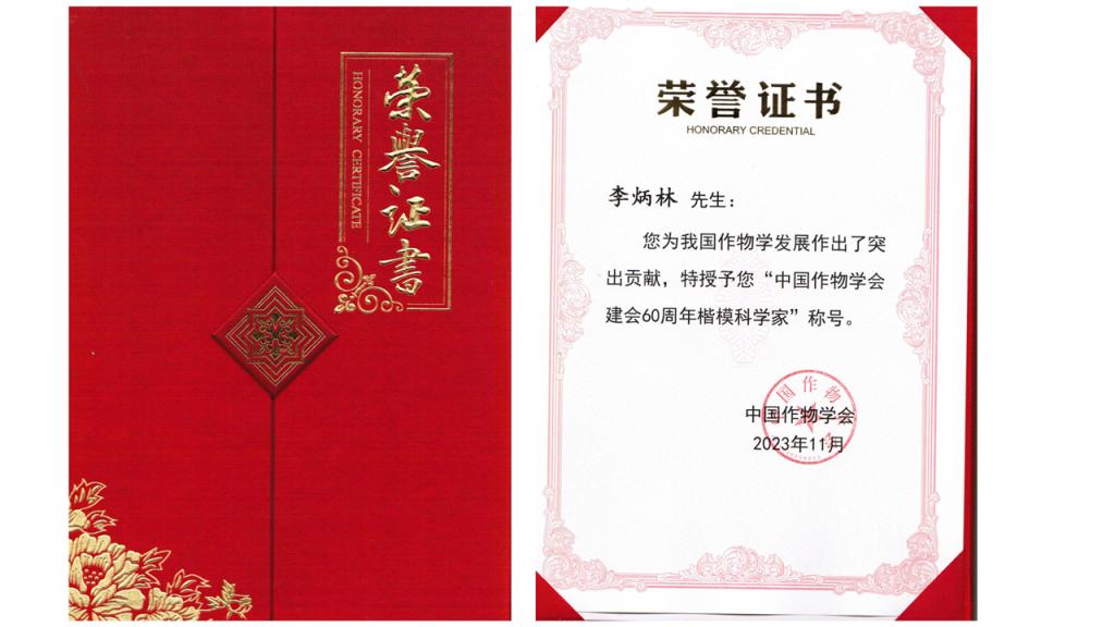 “中国作物学会建会60周年楷模科学家”荣誉证书