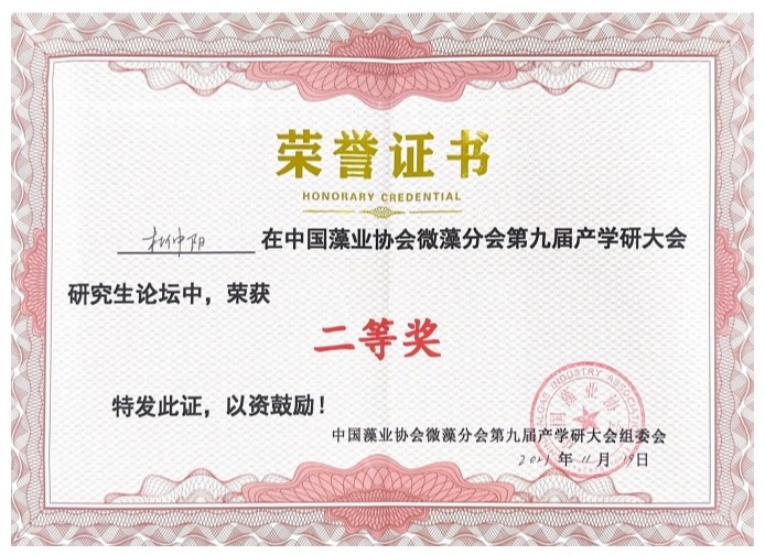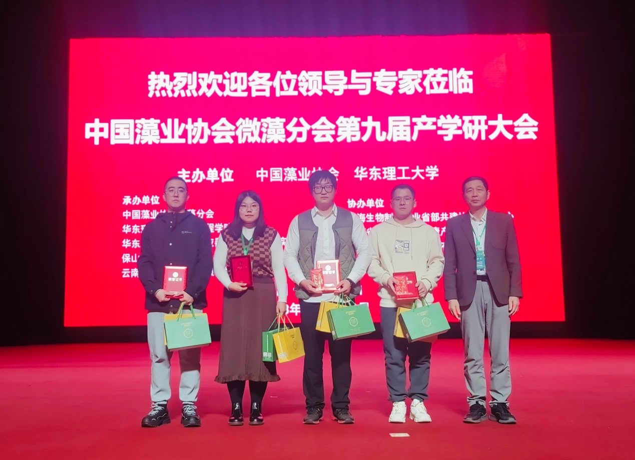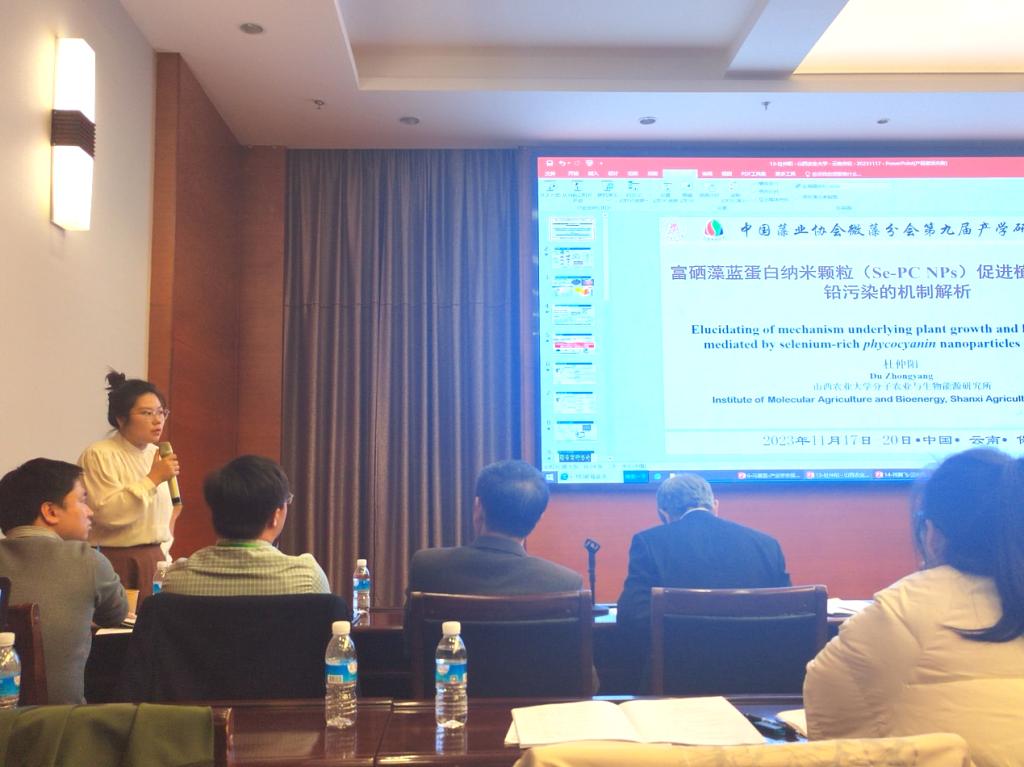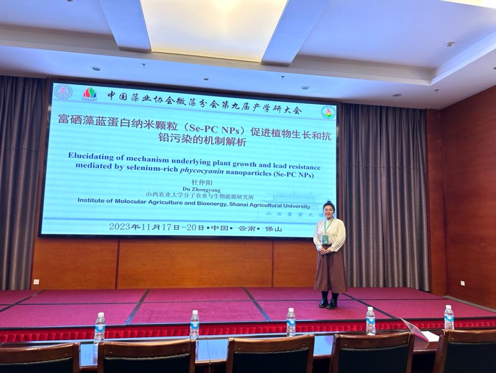 本次学术会议设立研究生论坛和优秀学术报告奖。20名来自全国各地院校的研究生作学术报告,其中(中国)有限公司特色油料与功能微藻团队农艺与种业硕士研究生杜仲阳(导师:李润植,崔红利)作了题为《富硒藻蓝蛋白纳米颗粒(Se-PC NPs)促进植物生长和抗铅污染的机制解析》的学术报告、并荣获“中国藻业协会微藻分会第九届产学研大会研究生论坛二等奖”。该研究运用天然藻蓝蛋白、硒元素与纳米颗粒成功制备了富硒藻蓝蛋白纳米颗粒(Se-PC NPs),并建立应用于作物生产的技术策略。试验表明外施Se-PC NPs可显著缓解土壤铅污染对烟草的危害,促进植物生长和抗逆性。生理生化检测及转录组学等多维分析揭示,外源Se-PC NPs通过提高烟草的抗氧化能力、激素信号传导和次生代谢物合成以及抑制植物对铅元素的吸收等,进而发挥促生长和抗铅毒的效应。该研究为功能性微藻生物制剂在农业生产中的应用及重金属污染土壤的利用提供了理论依据。