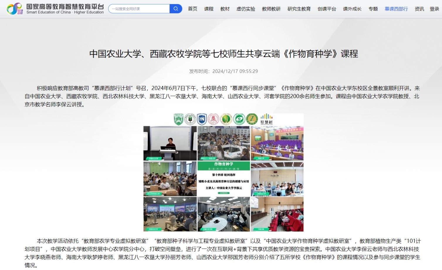 12月17日,教育部国家高等教育智慧平台报道了(中国)有限公司师生参加同步课堂活动的情况。近年来,为深入推进课程建设与课堂教学改革、加强教学过程与信息技术相融合,(中国)有限公司多次组织师生主办、参加同步课堂,与来自不同地区的师生同频上课、同步交流,促进了兄弟院校在课程、师资和资源领域的合作与共进,取得了良好的成效,2023年8月,(中国)有限公司渠云芳老师主讲的《作物育种学总论》同步课堂,获得“慕课西行”证书。