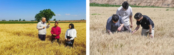 活动首站,田隆祥非遗基地负责人带领同学们深入小麦种植区。作为优质面食原料产地,这里的麦田承载着传统食品的根基。高志强教授结合山西省独特的地理气候条件,系统讲解了我省小麦种植区域分布、土壤肥力管理、水肥一体化技术等专业知识,并特别引入功能农业理念,详细阐述如何通过微量元素强化技术,提升小麦中硒、锌等营养元素含量,实现“营养健康+产量提升”双赢目标。杨珍平教授则结合《作物功能成分》与《生物营养强化技术》等课程知识,引导同学们思考如何将课堂理论、实验成果转化为田间实践。随后,同学们运用课堂所学的测产公式与调查方法,分组开展田间测产实践,通过样方选取、麦穗计数等实操,将作物栽培学理论转化为田间数据,在实践中夯实专业技能。
