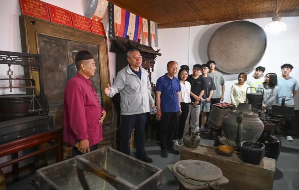 在非遗技艺传承环节,在基地田老板的热情介绍下,同学们深入了解了田隆祥的发展历程。作为第四代传人,田老板不仅坚守着家族传承的技艺,还积极培育第五代传承人,这份对非遗技艺的执着与坚守,深深感染了在场的每一位同学。从手工制面到非遗美食研发,四代人对传统工艺的坚守,让同学们深刻认识到农业不仅是作物生产,更是文化传承的重要载体。走进田隆祥博物馆,犁、石碾等古老农耕器具陈列有序,田老板结合山西旱作农业特点,讲解每件农具在整地、播种、收获环节的作用,使同学们直观感受到传统农耕智慧与现代农业技术的历史脉络。基于此,杨珍平教授进一步向同学们提出展望:如何将功能农业中的营养强化技术融入传统农耕智慧,实现文化传承与科技创新的有机结合。