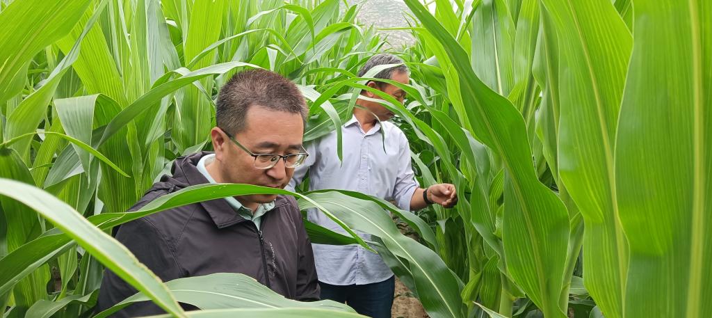 7月24日,项目组分别参观了玉米和谷子示范田。在玉米示范田,项目组成员现场察看了植株高度、叶片颜色及田间密度等情况。玉米株高普遍高于成年人的身高,株型挺拔、叶色浓绿、长势旺盛。项目组首席岳培荣表示,该田块整体种植管理水平较高,前期水肥调控合理,为形成良好产量打下了坚实基础。项目组鼓励村民继续加强后期管理,关注病虫害预警信息,适时调整营养供给和水分调控,确保玉米安全成熟、高产稳产。