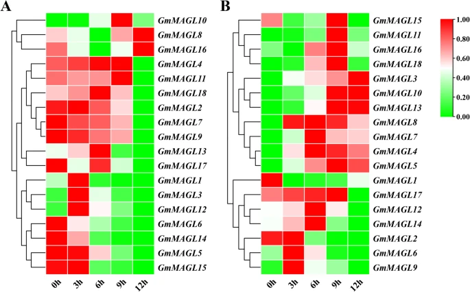 (干旱胁迫下18个GmMAGL基因在大豆幼苗根(A)和叶(B)的表达谱)
