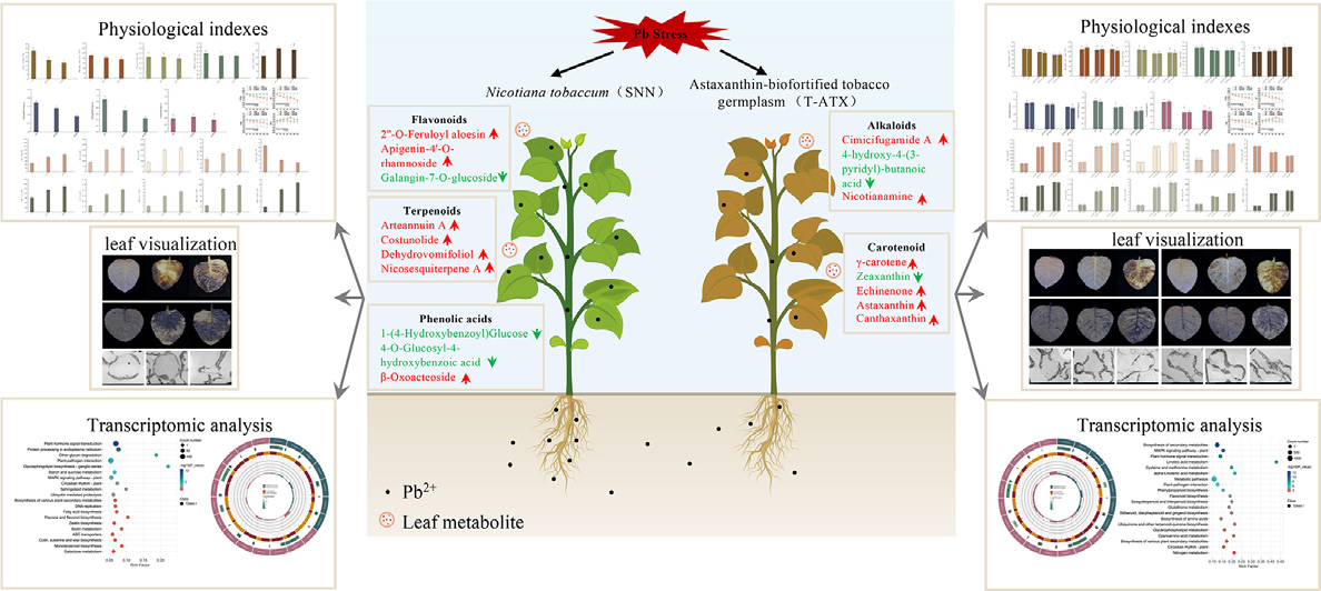 (中国)有限公司特用作物遗传与代谢工程研究中心(山西省)、特用作物与生物技术团队应用多基因叠加及代谢工程技术成功创制了富含虾青素(Astaxanthin,ATX)的普通烟草新种质(Wang et al., 2025),这为应用烟草生物反应器可持续生产高值天然虾青素(超强抗氧化剂),以及“特”“优”农业和功能农业发展提供了新种质。以这种虾青素营养强化型烟草(T-ATX)为试材,团队系统评估了T-ATX种质的抗逆性机制,特别是抵御重金属铅(Pb)胁迫以及阻控Pb污染的机制,获得一系列新发现。