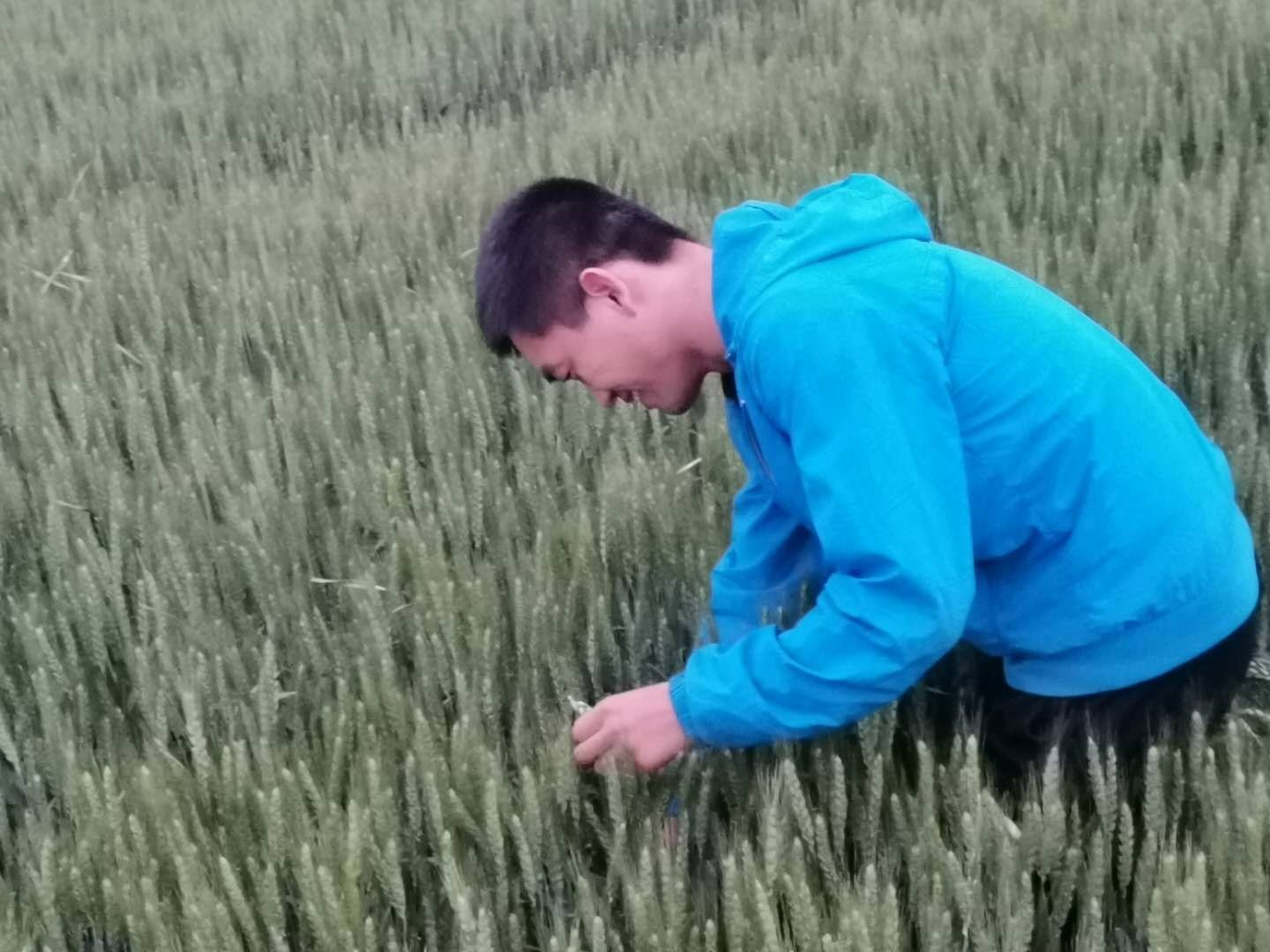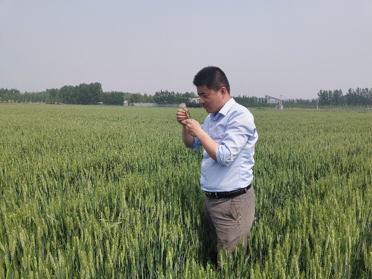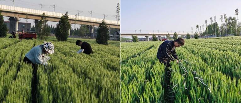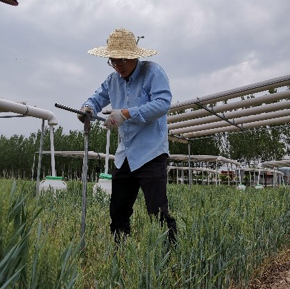 团队研究生在洪洞试验基地田间标记小麦开花情况