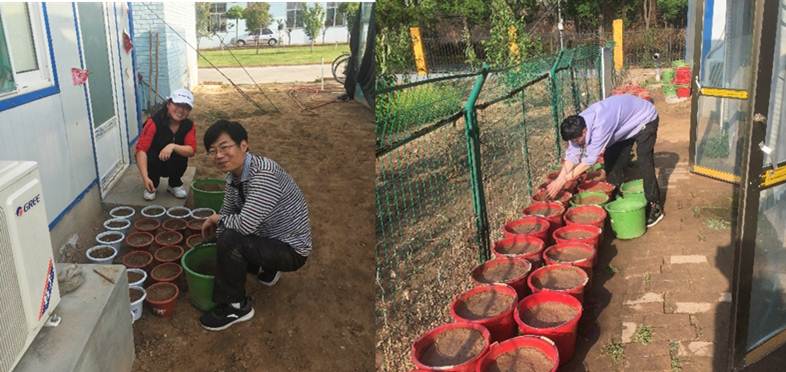 团队青年教师张东升带领研究生在安博官网体育农作站进行大豆盆栽试验播种