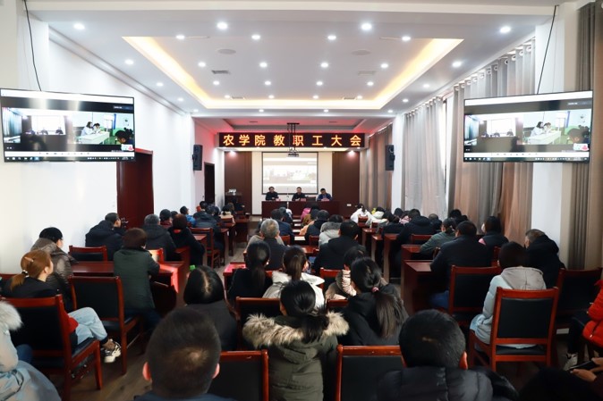 11月27日下午3点,安博官网体育于太谷校区主楼152教室和龙城校区五楼会议室以网络互联的形式同时召开了全院教职工大会。会议由学院党委副书记刘玲主持,全院170余名教职工参会。