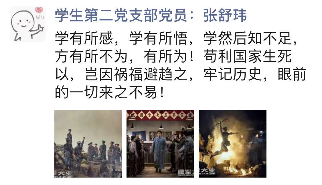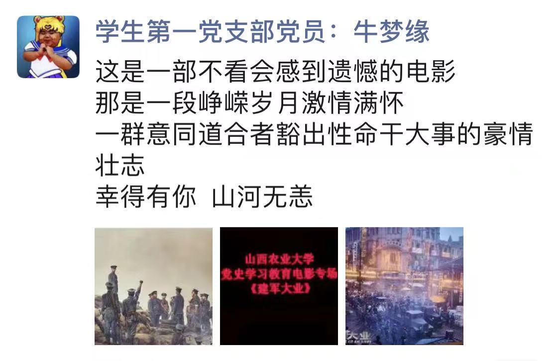 《建军大业》这部掺杂着血与泪的热血电影反映了中国革命一路走来的艰辛不易,更是体现了革命先烈们坚韧不拔的爱国信仰。作为一名基层党委副书记,我更加坚定了自身的理想信念,要立足岗位,担当作为,落实立德树人的根本任务,培养知农爱农的新型人才,以更优异的成绩向建党100周年献礼。