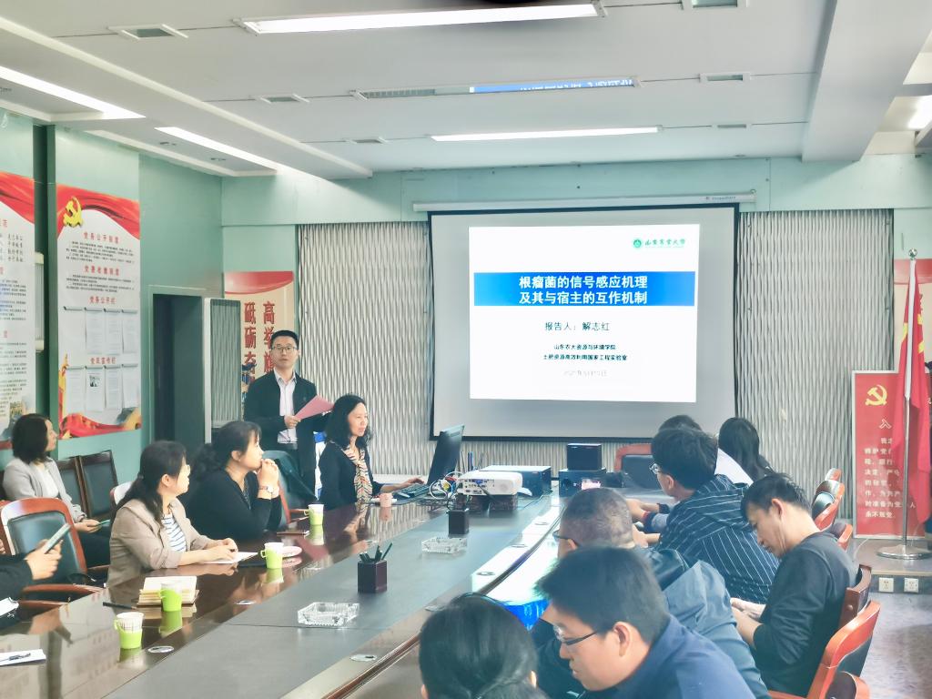 5月10日,山东农业大学解志红教授应安博官网体育邀请来校进行学术交流。在学院210会议室为师生作了题为《根瘤菌的信号感应机理及其与宿主的互作机制》的学术报告。报告会由安博官网体育副院长(主持工作)原向阳教授主持,安博官网体育、植保院和生科院等近百人师生参加了报告会。