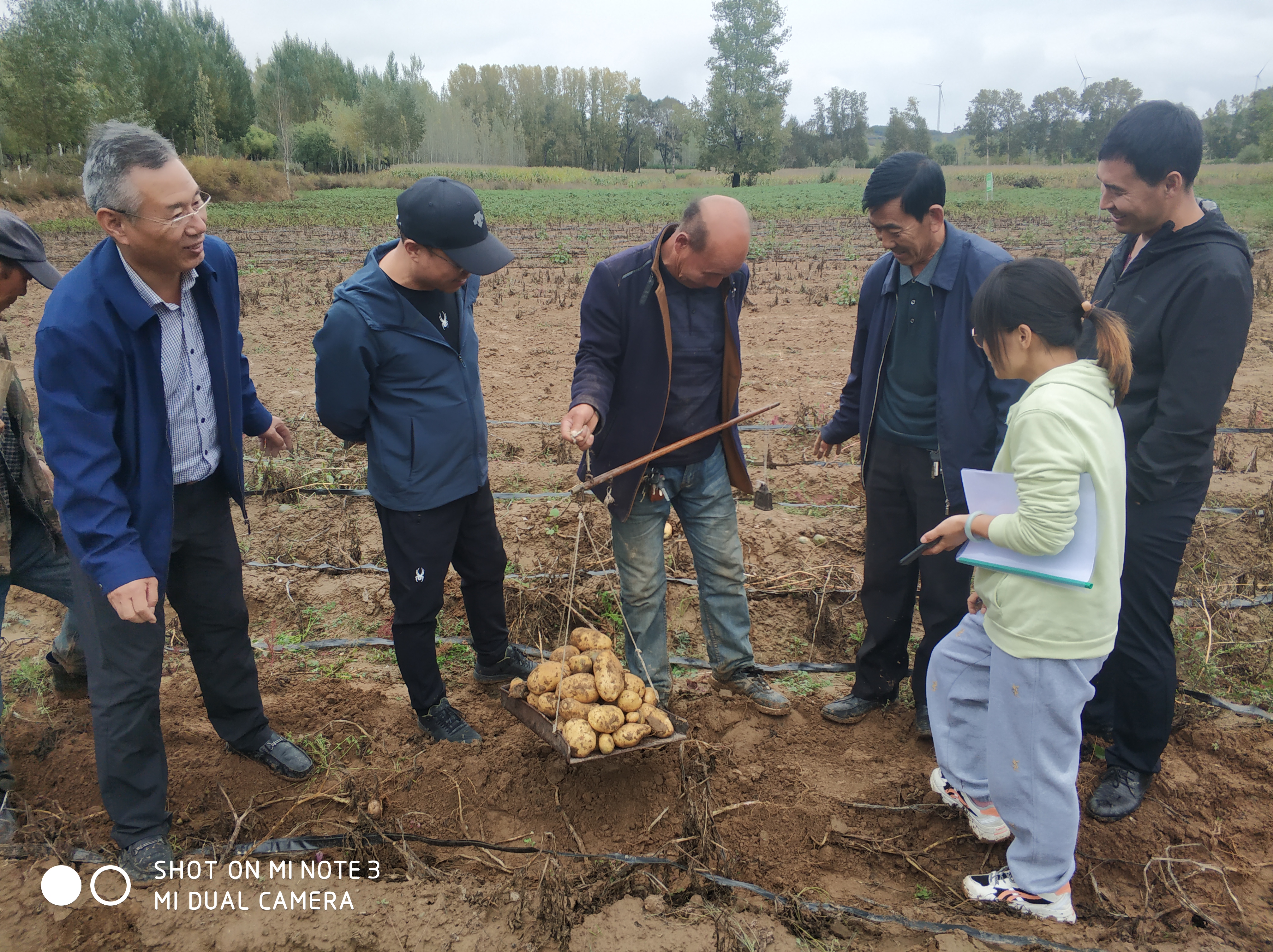 下午,赴岚县福众薯业种植基地对中国科协、院士团队牵手山西农大帮扶岚县马铃薯新品种展示筛选项目进行田间测产,测产的品种有中薯5号、并薯29号、荷兰806、英尼维特、云薯902、VF、冀张薯14号共八个品种。专家组在听取项目实施单位情况介绍、查验项目工作实施情况后,结合品种展示田间情况,严格按照标准实施测产,做到测量、称重、测算“三个精准”。经测算,早熟品种VF产量最高,亩产达3877.5kg,中薯5号次之,为2970.0kg;中晚熟品种英尼维特产量最高,亩产达3630.0kg,并薯29号次之,为3052.5kg;冀张薯14号通过育苗移栽,熟期提前20天左右,产量不减,亩产达3300.0kg。筛选品种均达到了岚县原种产量的先进水平,显示出“VF”和“英尼维特”马铃薯种薯生产潜力巨大,不仅促进了当地马铃薯产业发展,还为我省马铃薯种薯供应开辟了新的优质种源基地。