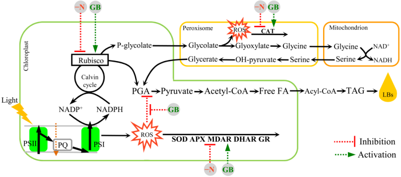 生物柴油被认为是化石燃料的绿色替代品,而由于微藻具有光合效率高、生物量积累快、不与耕地竞争等优点,因此利用微藻生产生物柴油是替代化石燃料的一种可行性方案。微藻油脂积累量的增加可以进一步提高其在生物柴油生产中的利用价值,其中氮缺乏是诱导微藻油脂合成的有效策略之一。然而,缺氮会使光合作用碳同化能力降低、引起光抑制进而产生大量的活性氧等,最终导致微藻的生物量和油脂积累量降低。因此,亟需找到一种在光照缺氮条件下能够保护微藻细胞内代谢进而提高其油脂含量的方法。本研究发现通过外源添加甜菜碱能够提高缺氮条件下微拟球藻的光合碳同化、生物量积累及油脂产量。