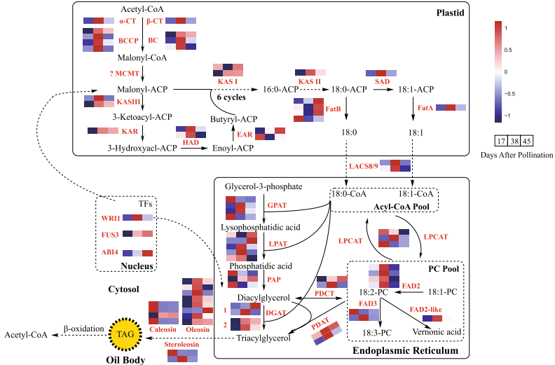 近日,安博官网体育分子农业与生物能源研究所李润植教授团队在Biotechnology for Biofuels and Bioproducts (IF=6.485, SCI 1区Top) 发表了题为“Critical metabolic pathways and genes cooperate for epoxy fatty acid-enriched oil production in developing seeds of Vernonia galamensis, an industrial oleaginous plant”的研究论文。该研究以工业油料植物斑鸠菊为研究对象,应用高通量测序平台进行转录组测序,从差异表达基因中鉴定得到多个参与环氧化油脂生物合成的重要基因及转录因子,通过活体和离体等测试,进一步对控制斑鸠菊种子环氧化油脂积累的关键基因进行了功能分析,并绘制了斑鸠菊种子环氧化油脂生物合成的路径图,提出在高生物量植物目标器官组装富集工业特用油脂途径的代谢工程策略。