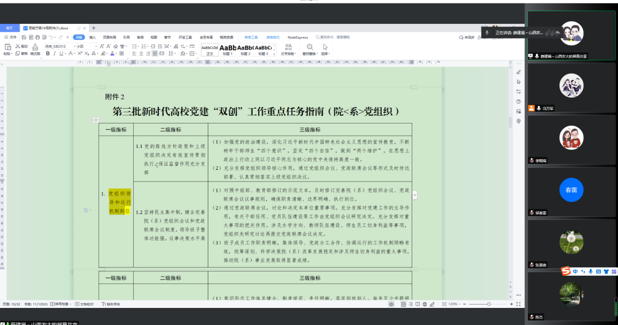 支部宣传委员薛建福同志带领支部成员重点学习了《指南》中的院<系>党组织五个到位和基层党支部七个有力重点任务指南。他提到,应当把《指南》贯彻落实同学校三全育人、教师立德树人等相关工作结合起来,注重发现树立、宣传推广师生身边典型人物、典型事迹,加强党建工作与业务开展融合。