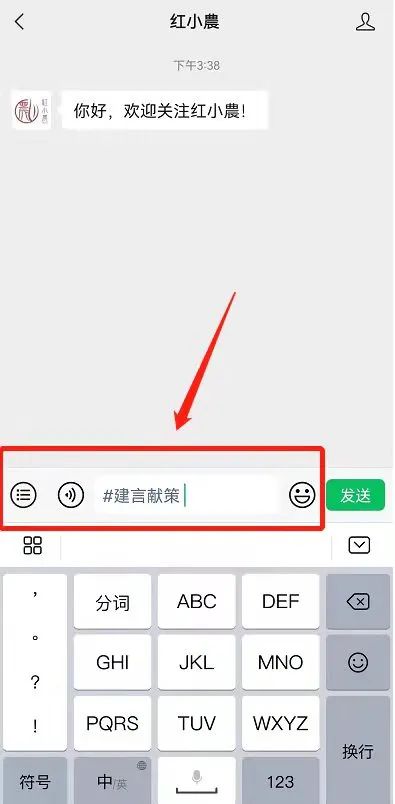 4.点击消息底部的对话框写#建言献策+您的意见建议,然后点击发送,我们就可以收到