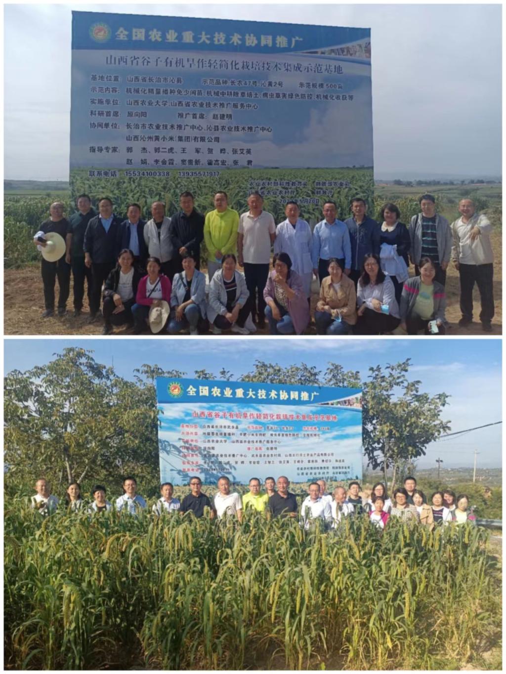 全国农业重大技术协同推广“山西省谷子有机旱作轻简化栽培技术集成示范”项目在武乡县丰州镇采用“地膜覆盖精量播种+羊肥小米专用肥+病虫䓍害绿色防控+机械化收获”等4项核心技术,以晋谷21号、长生13为主推品种,集成示范300亩。在沁县定昌镇烟立村基地核心示范面积500亩,配套品种为优质谷子新品种长农47号和山西沁州黄小米(集团)有限公司主营优质谷子品种沁黄2号,主要采用“机械化精量播种少间苗+机械中耕除草培土+病虫䓍害绿色防控+机械化收获”等4项核心技术。