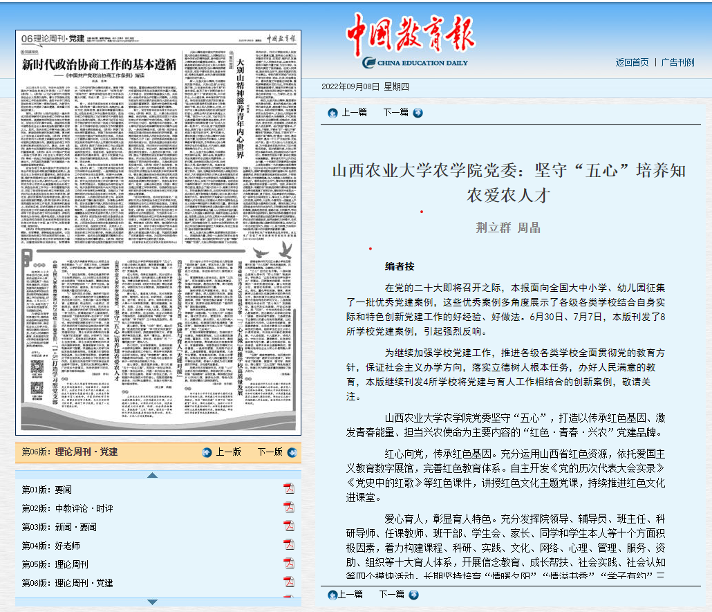 9月8日,《中国教育报》第6版理论版以《安博官网体育党委:坚守“五心”培养知农爱农人才》为题,专题报道我校安博官网体育将党建与育人工作相结合的创新案例。