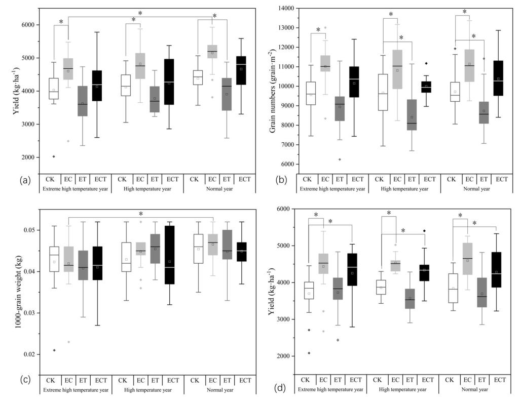 地球系统模型预测未来2100年大气[CO2]将升高至400–1000 µmol·mol–1(SSP1-1.9–SSP5-8.5),温度将升高至1.6–4.5℃,且极端温度发生频率增加。了解温度升高和[CO2]升高对不同作物品种的影响,对于在适应气候变化的背景下制定农艺策略和品种选择至关重要。人工气候室结合作物模型模拟结果表明,[CO2]升高和2℃增温显著缩短了两个品种小麦播种和拔节天数进而缩短了整个生长期。2℃增温和[CO2]升高主要通过改变籽粒数来影响小麦产量。[CO2]升高能够缓解2℃增温对两个品种小麦产量的负效应,且对早熟品种的影响更为显著。极端高温降低晚熟品种产量,但对早熟品种无显著影响。早熟品种较短的生长期,可以一定程度上减少极端高温下热胁迫对小麦生产的损害。结果表明,在黄土高原东部地区,早熟品种比晚熟品种更能适应CO2浓度升高和气温的升高。