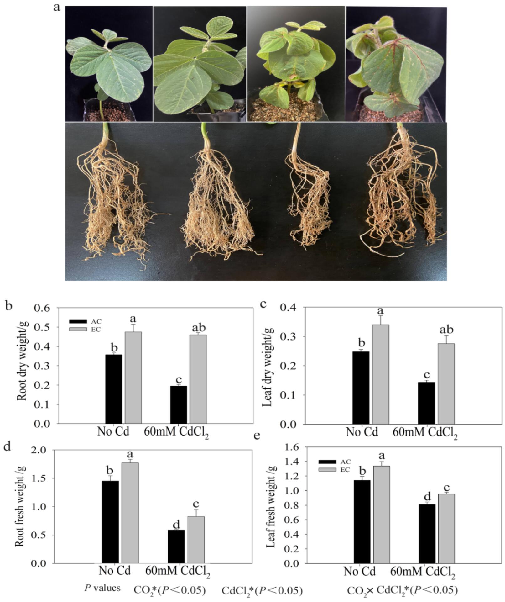图1 不同CO2 浓度和镉浓度处理下大豆形态指标变化