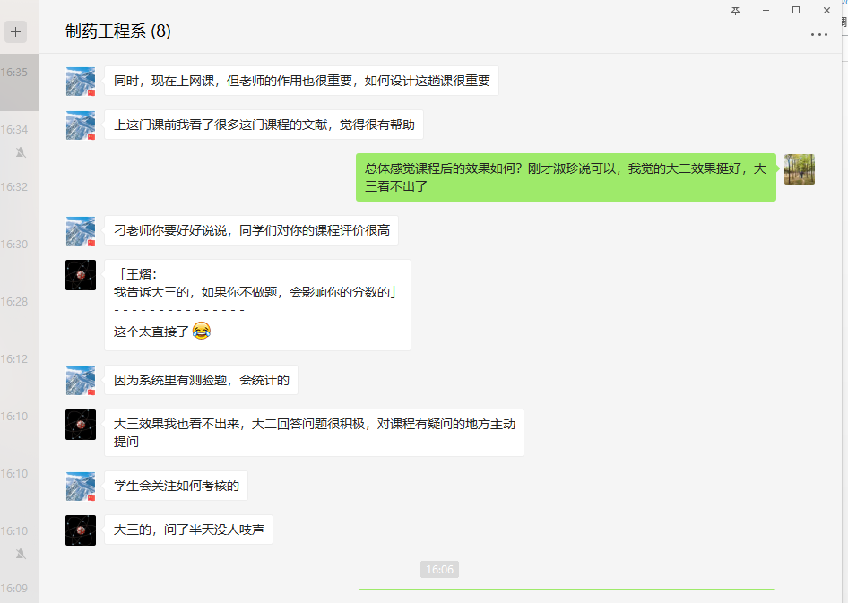 教师:通过课堂测试、在线提问、实时讨论等环节掌握学生学习质量,表明总体教学质量较好,但同时也存在个别学生不认真、不积极、敷衍应付的情况。