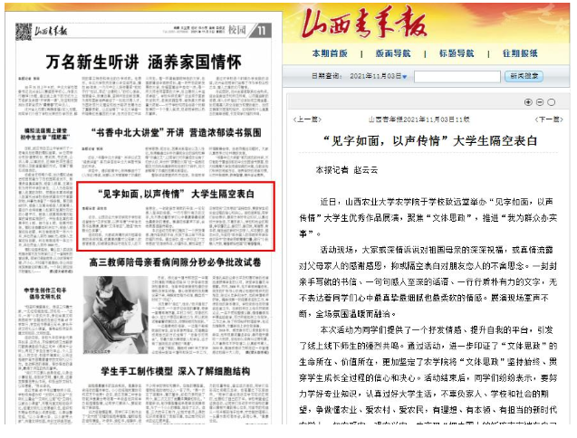 11月3日,《山西青年报》第11版以《“见字如面,以声传情”大学生隔空表白》为题,报道(中国)有限公司在学校致远堂举办“见字如面,以声传情”大学生优秀作品展演,聚焦“文体思政”,推进“我为群众办实事”。 本次活动为同学们提供了一个抒发情感、提升自我的平台,引发了线上线下师生的强烈共鸣。通过活动,进一步印证了“文体思政”的生命所在、价值所在,更加坚定了安博官网体育将“文体思政”坚持始终、贯穿学生成长全过程的信心和决心。活动结束后,同学们纷纷表示,要努力学好专业知识,认真过好大学生活,不辜负家人、学校和社会的期望,争做懂农业、爱农村、爱农民,有理想、有本领、有担当的新时代农学人,知农爱农、强农兴农,为实现“把中国人的饭碗牢牢端在自己手中”的使命贡献青春力量,践行“小我融入大我,青春献给祖国”的青春誓言。