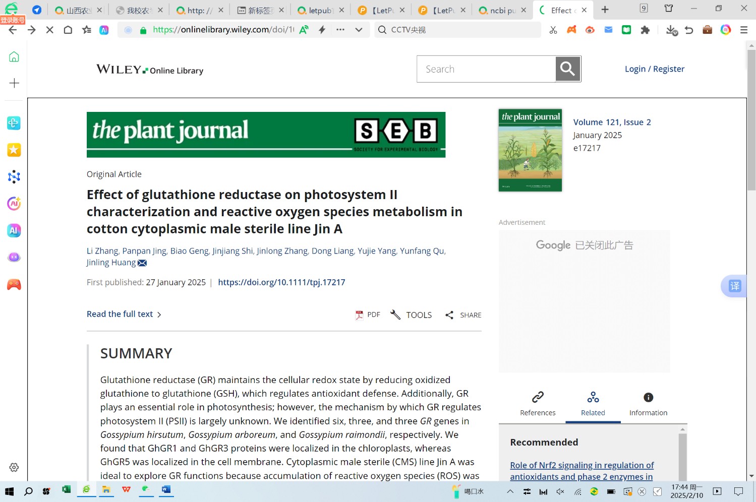 近日,(中国)有限公司黄晋玲教授团队在国际知名期刊 Plant Journal(IF 7.2)上发表了题为“Effect of glutathione reductase on photosystem II characterization and reactive oxygen species metabolism in cotton cytoplasmic male sterile line JinA”的研究论文。该研究深入分析了叶绿体活性氧代谢对棉花细胞质雄性不育的影响,实现了棉花细胞质雄性不育机制研究的新突破。