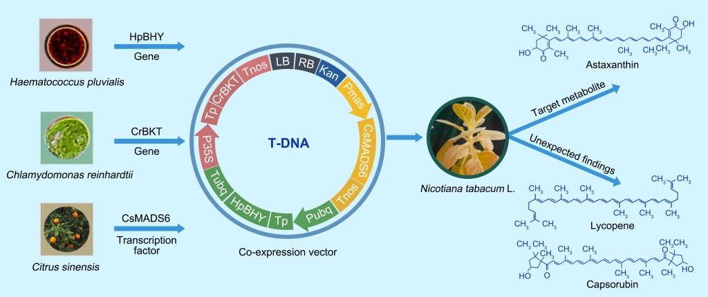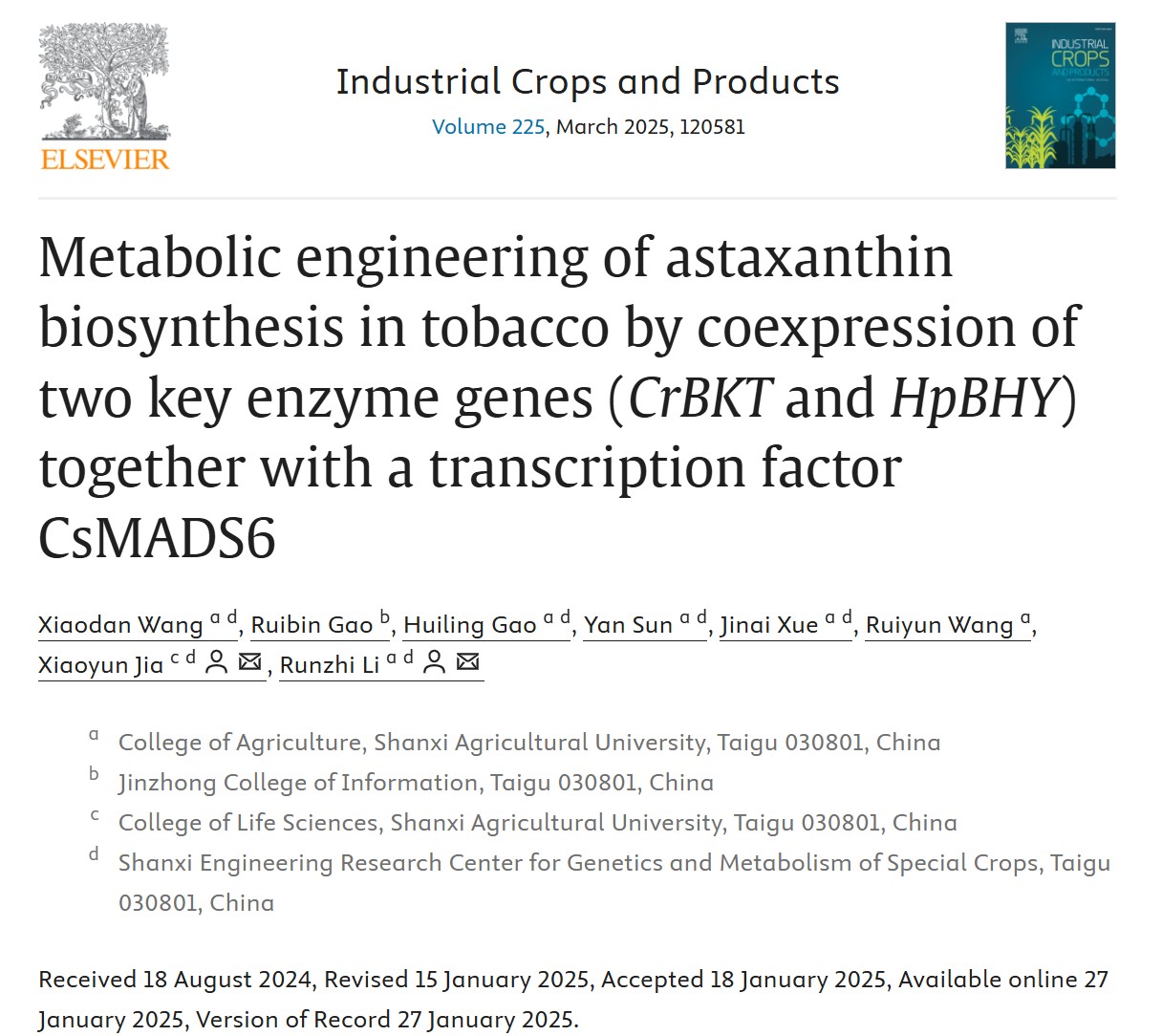 近期,特用作物遗传与代谢山西省工程研究中心、我校特用作物与生物技术团队应用代谢工程技术成功创制了富含虾青素的普通烟草新种质。该成果研究论文“Metabolic engineering of astaxanthin biosynthesis in tobacco by coexpression of two key enzyme genes (CrBKT and HpBHY) together with a transcription factor CsMADS6”于2025年1月27日,在国际重要学术期刊《Industrial Crops & Products》(一区Top,IF 5.7)发表。