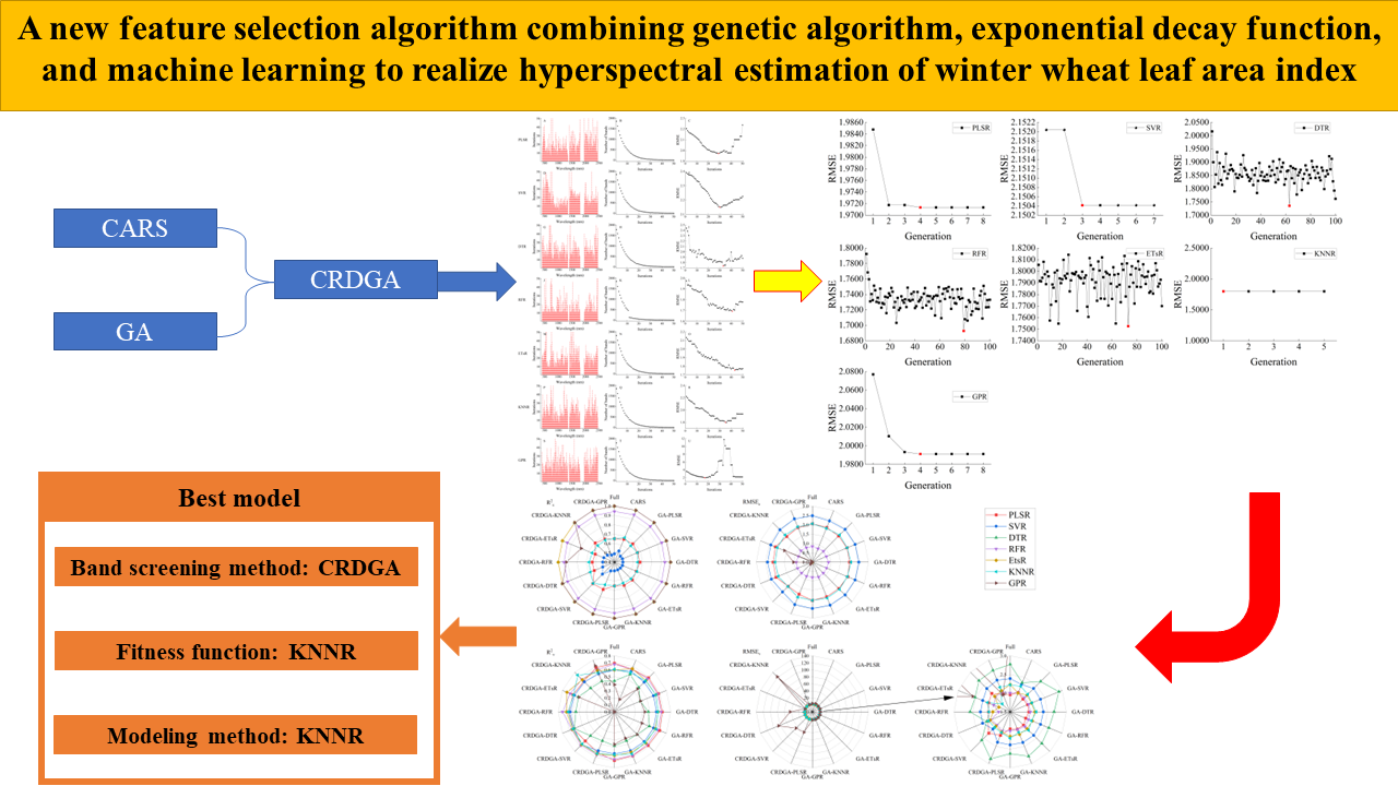 传统的遗传算法(GA)在波段数量筛选方面不能进行较好的控制,往往保留了较多的波段数量,不利于模型的构建。该研究将竞争性自适应重加权采样算法(CARS)中的指数衰减函数与GA进行结合,提出连续重加权衰减遗传算法(CRDGA),以更好地控制特征波段的筛选结果。同时考虑将决策树回归等多种机器学习算法作为适应度评价函数。该研究成果以安博官网体育为第一单位,以“A new feature selection algorithm combining genetic algorithm, exponential decay function, and machine learning to realize hyperspectral estimation of winter wheat leaf area index”为题发表在中科院一区TOP期刊Computers and Electronics in Agriculture上。研究结果表明,新提出的CRDGA算法可以对筛选结果进行有效控制,同时具备较快的收敛速度,在性能上均优于GA和CARS。该方法为冬小麦LAI的高光谱估测提供了一定的技术支持。