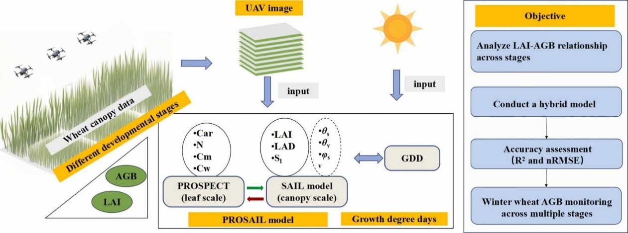 辐射传输模型PROSAIL模型通过解释冠层内的辐射传递过程,有助于在生物量和遥感观测之间建立明确的物理关系。然而,使用固定参数Cm可能无法充分捕捉不同生长阶段AGB的变化。因此,该研究提出了将PROSAIL模型与生长度日(GDDs)相结合的混合方法来检索AGB,以解决生物量模型不能跨各生长阶段扩展的局限性。该研究成果以安博官网体育为第一单位,以“A UAV-based hybrid approach for improving aboveground dry biomass estimation of winter wheat”为题发表在中科院一区TOP期刊European Journal of Agronomy上。研究结果表明混合方法在多生长阶段的生物量监测中表现优异,该方法扩展了PROSAIL模型的应用潜力,在不同生长阶段的AGB估计中具有较强的鲁棒性和通用性,为其他作物的AGB估计提供了技术支持。