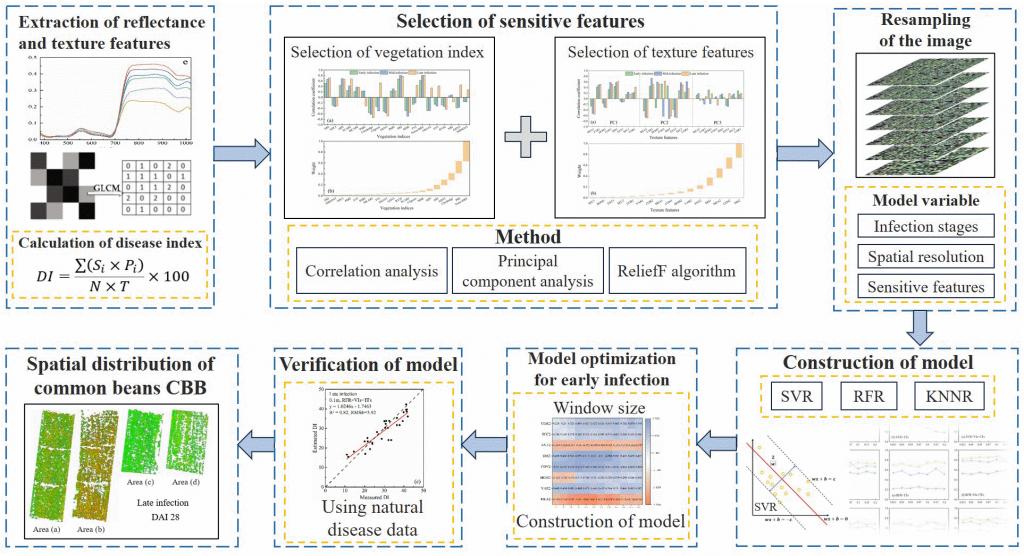 普通细菌性疫病(CBB)是红芸豆生产上危害最严重的细菌性病害。在气候变化背景下,温度升高可使病原菌提前结束休眠期,导致红芸豆在更早的生育时期感病,这种感染模式也加强了在早期发现CBB的重要性。因此,该研究基于无人机高光谱图像,通过筛选最佳空间分辨率及调整纹理窗口尺寸,实现了对CBB感染早期监测模型的优化。该研究成果以安博官网体育为第一单位,以“Evaluating the potential of airborne hyperspectral imagery in monitoring common beans with common bacterial blight at different infection stages”为题发表在中科院1区TOP期刊Biosystems Engineering上。研究结果表明,在CBB感染早期选择合适的空间分辨率和纹理窗口尺寸能够有效提高模型监测精度,为机载或星载成像光谱精准监测红芸豆普通细菌性疫病提供技术支持。