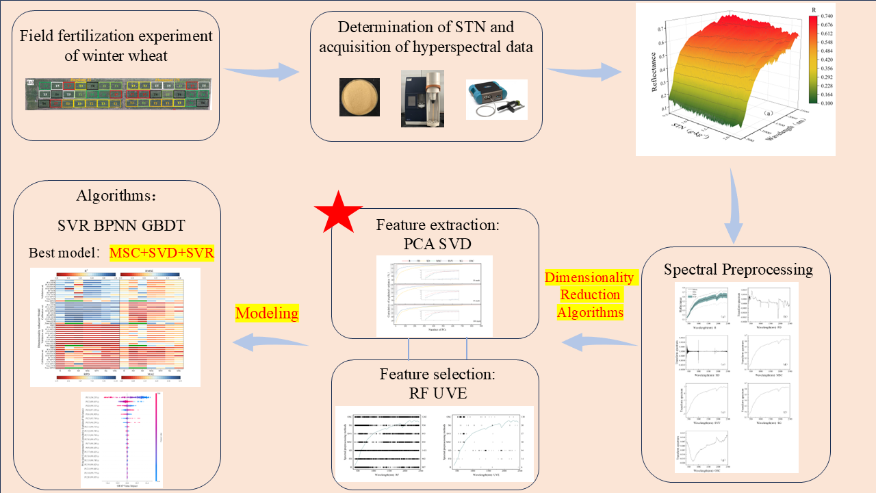 土壤氮素供应水平深刻影响着冬小麦的生长发育和产量形成能力,利用高光谱遥感技术实时无损估算土壤全氮含量对作物施肥和精准农业发展具有重要意义。高光谱技术在应用中尚面临着海量数据处理和高计算复杂度的挑战,因此,课题组围绕降维算法在麦田土壤全氮含量高光谱估测中的应用开展研究。该研究成果以安博官网体育为第一单位,以“Comparative analysis of the effects of different dimensionality reduction algorithms on hyperspectral estimation of total nitrogen content in wheat soils”为题发表在中科院一区TOP期刊European Journal of Agronomy上。研究结果表明特征提取算法PCA和SVD在提高光谱建模精度方面表现出更明显的效果,MSC预处理+SVD降维所构建的SVR模型在土壤全氮含量估测方面表现优异,为土壤养分含量快速检测提供了理论支持。