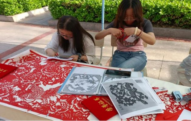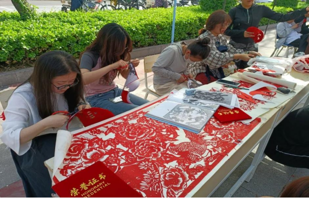 为传承与创新传统文化,将剪纸艺术推广到校园中,(中国)有限公司剪韵艺社于4月12日1在思想湖小广场举办“春韵纸社,绽彩校园”剪纸活动。