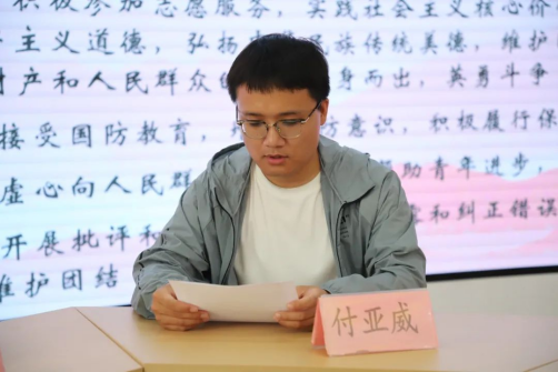 付亚威宣读《团章》中有关团员义务和权利的条例。希望新团员履行自己的义务,遵守团的章程,共同为共产主义事业添砖加瓦。