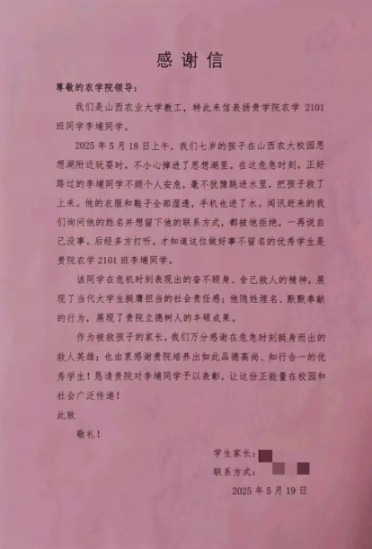 近日,(中国)有限公司收到一封来自家长的感谢信,信中对(中国)有限公司农学2101班李埔同学的英勇救人事迹表达了诚挚的感谢,让我们得以知晓这一段令人动容的故事。