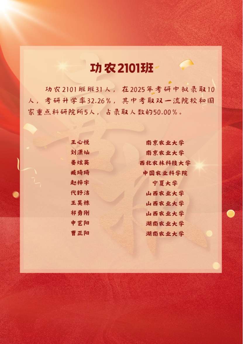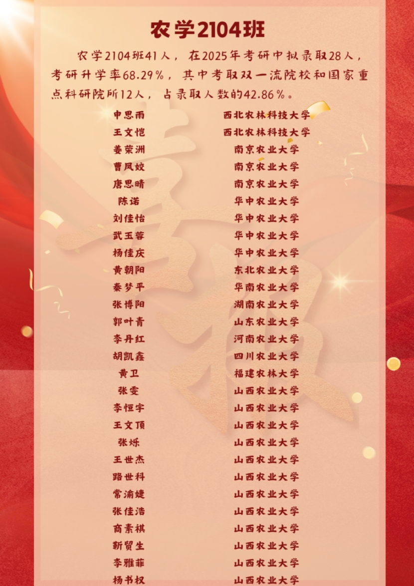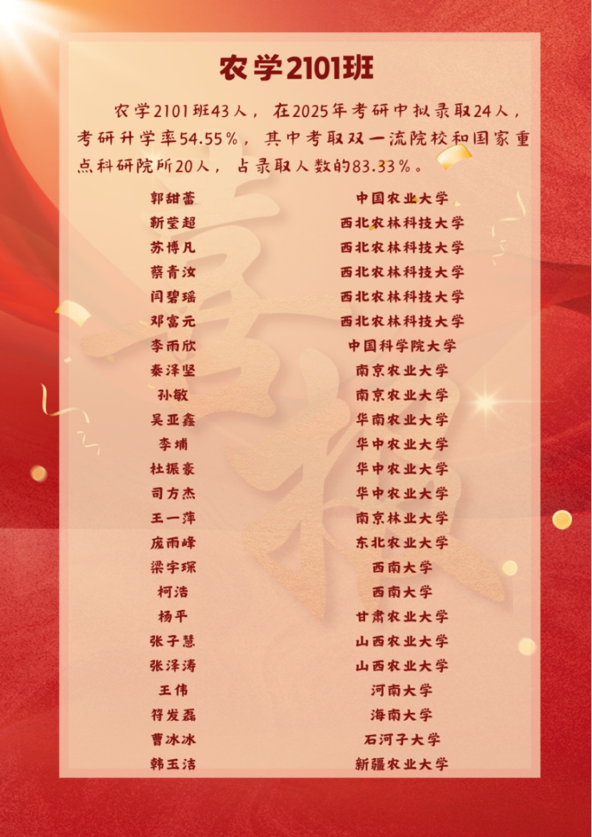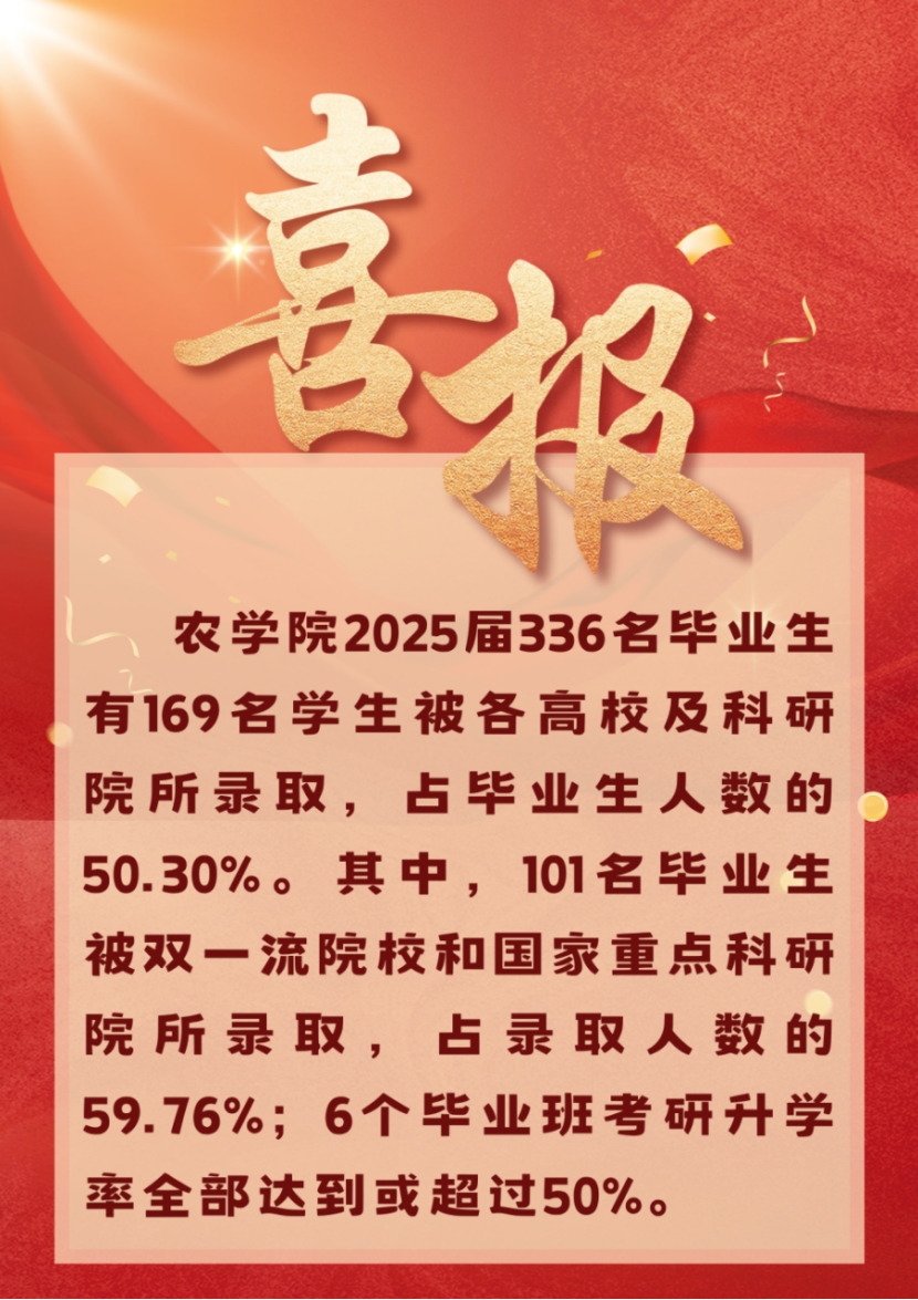 这份亮眼的考研成绩单,不仅是莘莘学子以智慧和汗水书写的青春答卷、以无畏勇气跨越挑战的逐梦见证,更是学院深耕“三农”特色育人理念结出的硕果。多年来,学院立足乡村振兴战略需求,将学风建设与农业人才培养深度融合,在“厚植三农情怀、培育兴农英才”的育人沃土上,源源不断为国家农业发展输送优质人才,以青春热血浇灌三农未来!