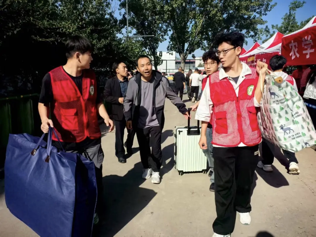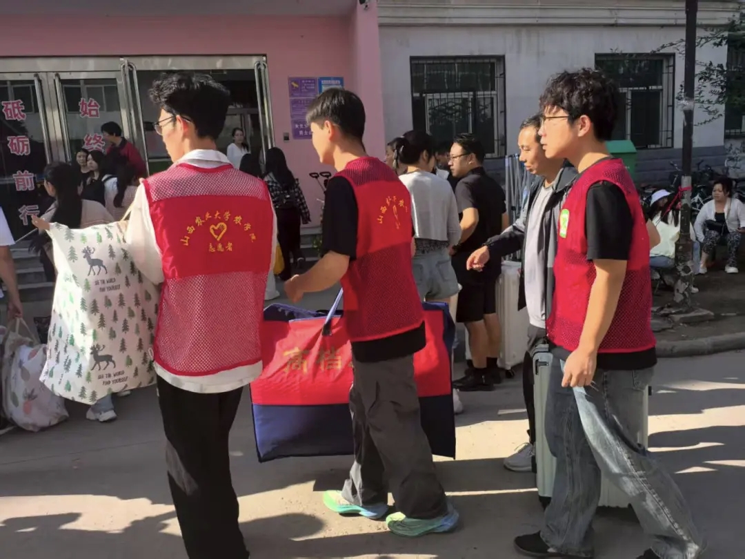 今年(中国)有限公司迎新点设置于西门、15号与17号学生公寓楼前,现场随处可见醒目的迎新指引牌、温暖的欢迎标语。身着红色马甲的志愿者们早已守候在各迎新点位,他们以饱满的热情和细致的服务,为每一位新生提供贴心帮助:从答疑解惑、指引路线,到协助办理入住、搬运行李,用行动传递着温暖与关怀。