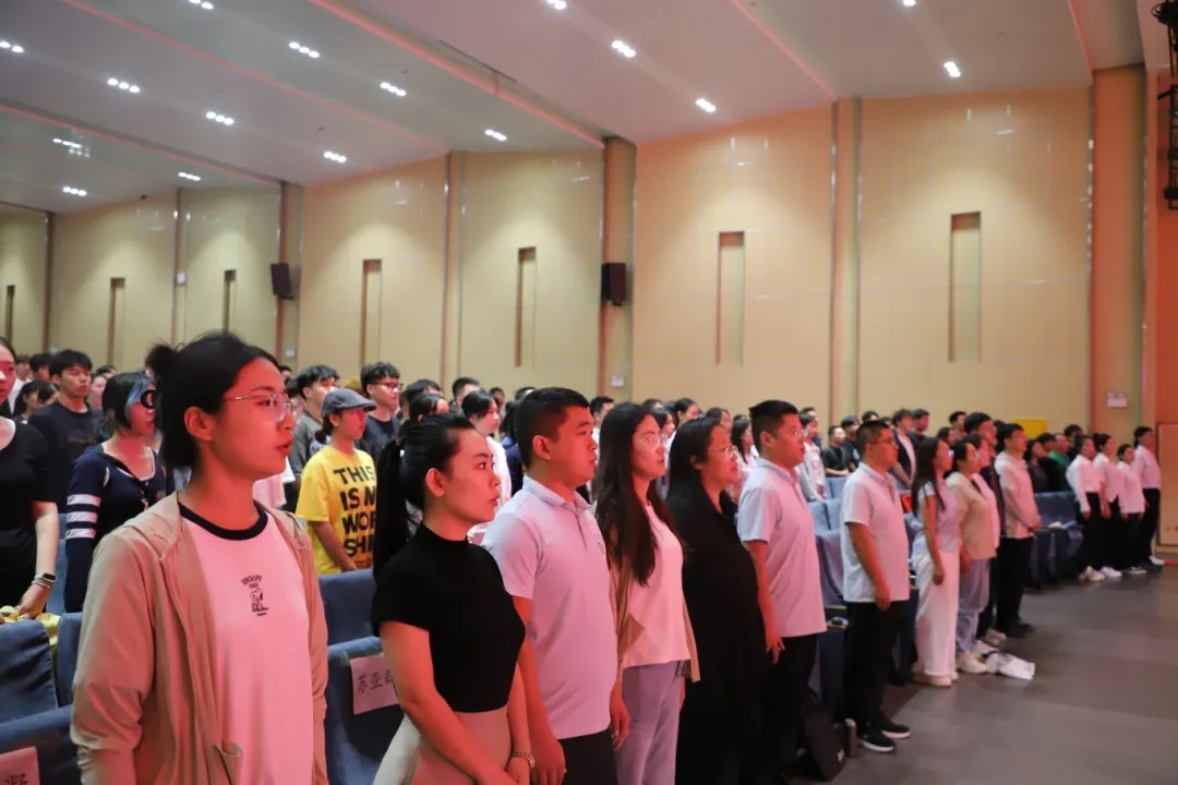 全体师生肃立齐唱国歌,激昂的歌声响彻会场。
