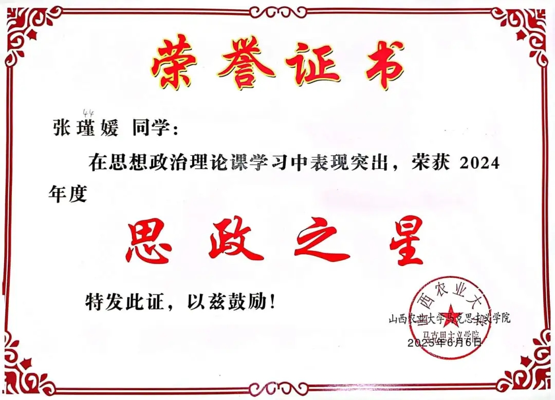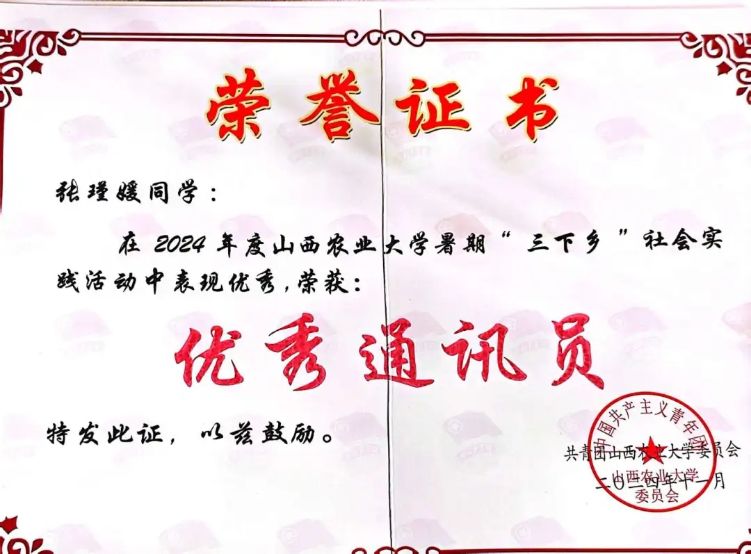 大一学年,我积极参与校园实践与社会实践:在山西农业大学青年融媒体中心新闻部、院辩论队担任志愿者,负责现场采访与新闻稿撰写;2024年暑期“三下乡”活动中,因表现突出获评“优秀通讯员”。
