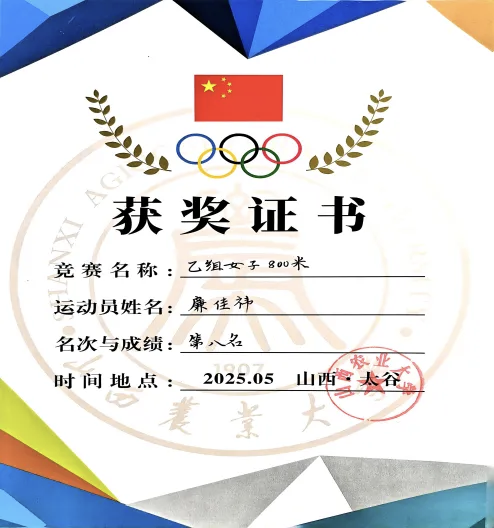 2025年 荣获“优秀团干部”、第60届田径运动会乙组女子800米第八名。