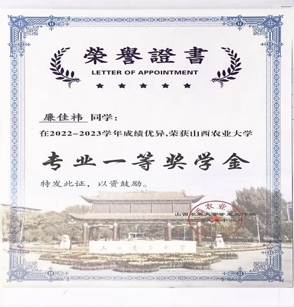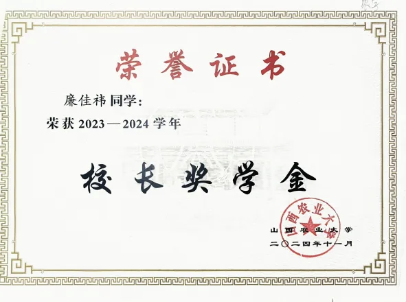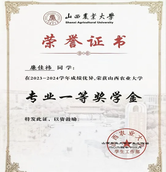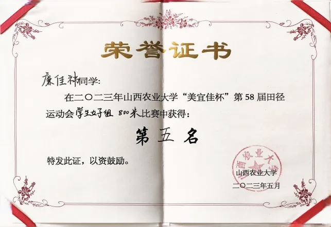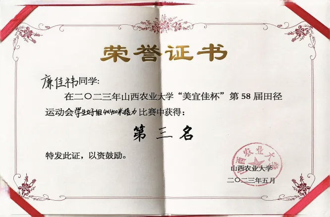 在学习上,我始终秉持“脚踏实地、精益求精”的态度,将对农业科学的热爱转化为钻研动力。在2024-2025学年,学习成绩均分92.84,学分绩点4.49,学习成绩与综合考评连续三年专业第一,并连续两年获得专业一等奖学金、“校长奖学金”和“优秀学生”,现已成功保研至中国科学院遗传与发育生物学研究所农业资源研究中心;体测成绩85.6分,连续三年保持“良好”以上水平,在山西农业大学第58-60届田径运动会中,先后获得800米比赛第五名、第八名,4×400米接力比赛第三名,以强健体魄为学业与科研筑牢基础。