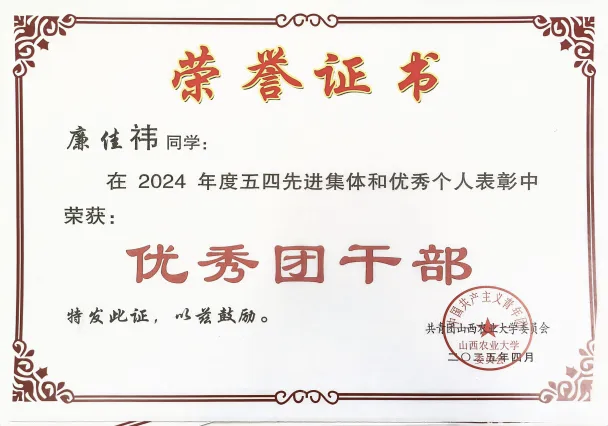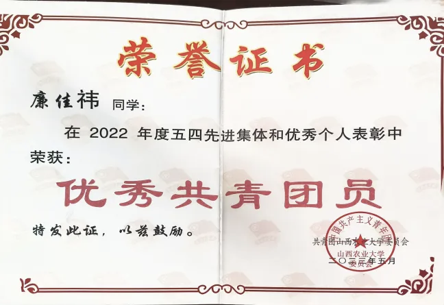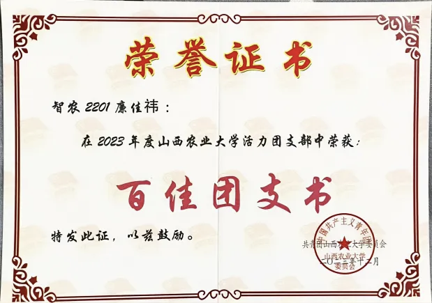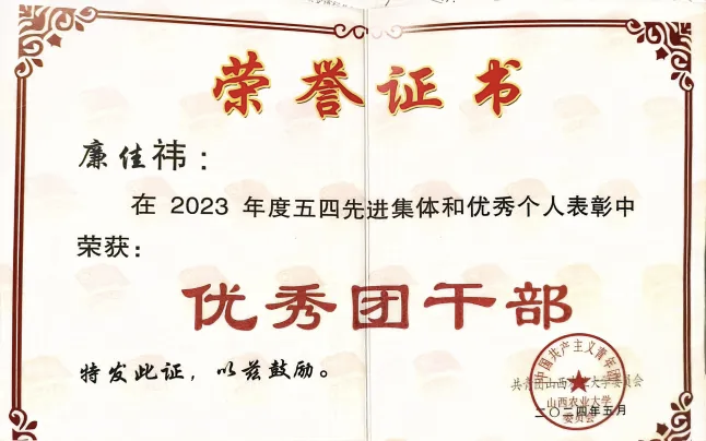 我担任班级团支书,帮助同学,配合老师工作,组织会议和各类文体活动,曾荣获“百佳团支书”和“优秀团干部”称号,主动带头参加排球、校运会等比赛,并取得较好成绩。课外我有参加暑期研学实践,调查锁簧镇特色富硒资源,并撰写了一份《发展乡村富硒产业,有效衔接乡村振兴》的万字调研报告,为政府提供参考建议。今年还在山西省第七届文博会上,对农大科技创新园区的产品,灵芝和文玩玉米,进行了推广宣传。