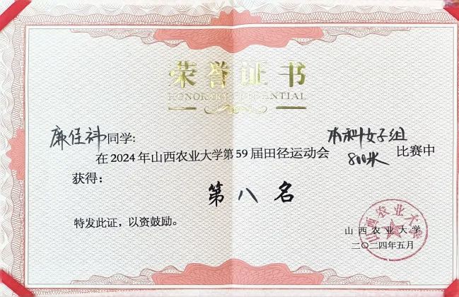 2024年 荣获专业一等奖学金、“校长奖学金”、“优秀学生”、“优秀团干部”、第59届田径运动会本科女子组800米第八名和4*400米接力第五名;
