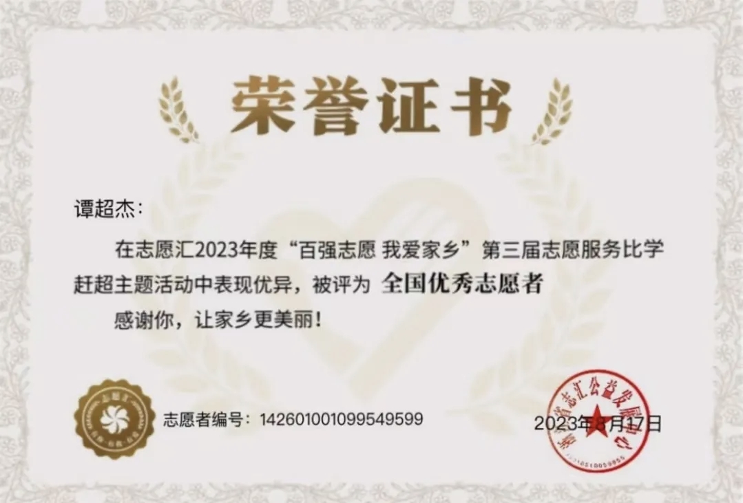2023年 专业四等奖学金,返家乡志愿活动中被评为优秀志愿者