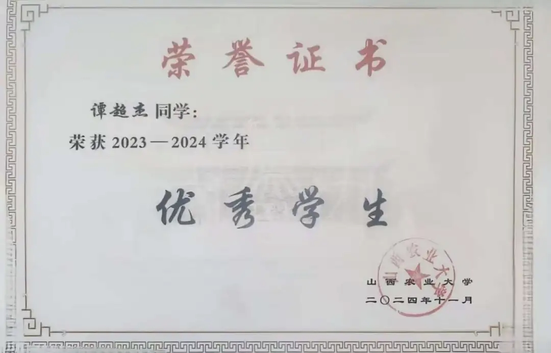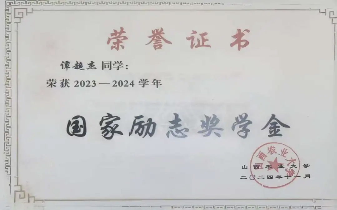 转眼间,大学时光已走过三年半。回望过去,没有惊天动地的成就,却满是脚踏实地的成长;展望未来,我希望能把课堂上学到的理论知识,真正用到田间地头的实践中,读懂每一寸土地的需求,成为懂农、爱农、兴农的践行者。今天,我因山西农大而自豪;期待多年后,山西农大能因我而骄傲。获奖感言:我非常荣幸能够获得国家励志奖学金,同时我也十分感谢国家设立这一奖学金,它不仅是对我学业成绩的肯定更是对我未来发展的鼓励。在这个充满机遇与挑战的时代,这份荣誉对我来说,意义非凡。未来的日子里我将不忘初心,继续努力学习,提升自己的综合素质,希望通过自己的努力回馈社会,帮助更多需要帮助的人。