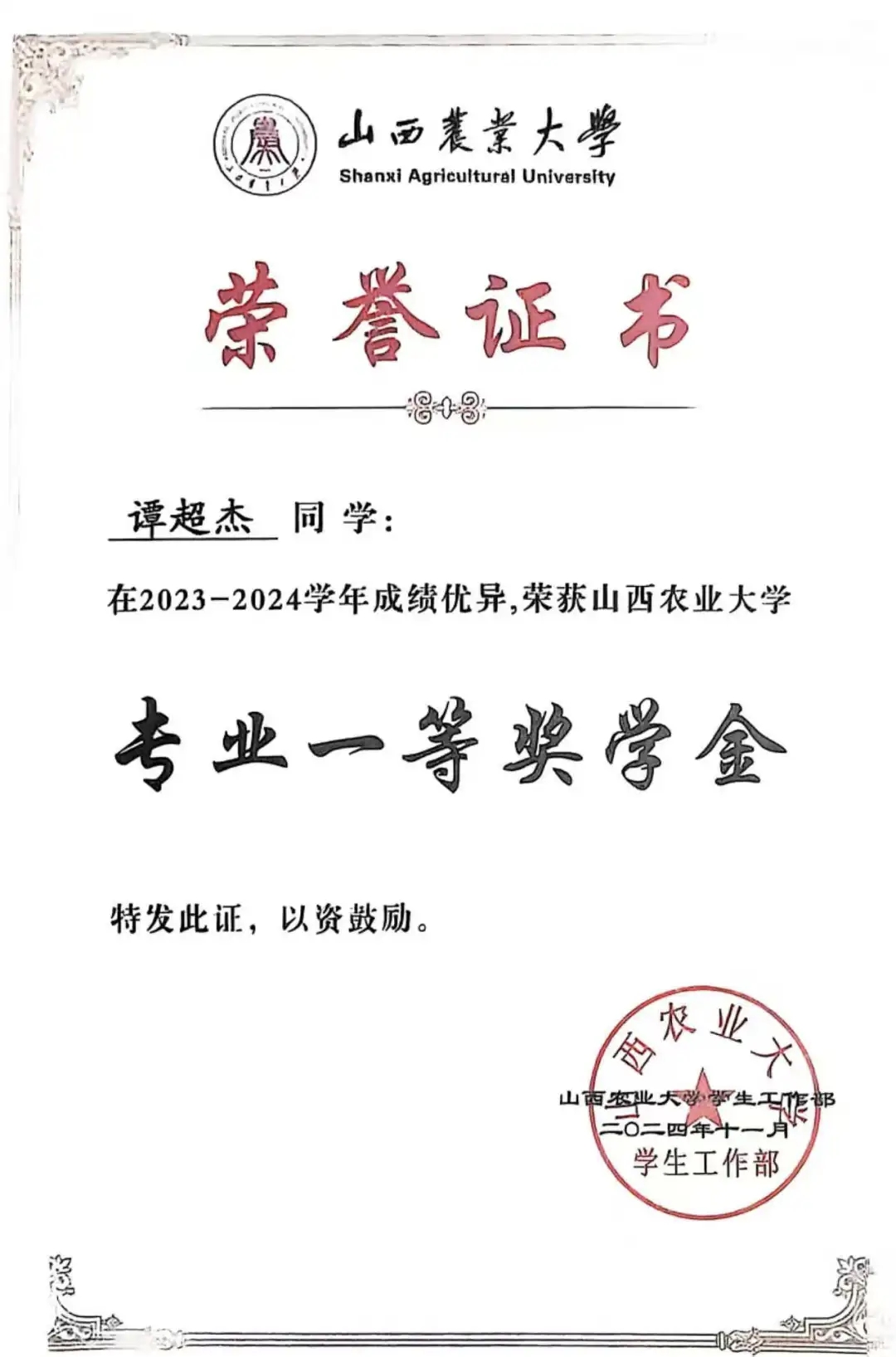 2024年 专业一等奖学金,荣获国家励志奖学金,优秀学生