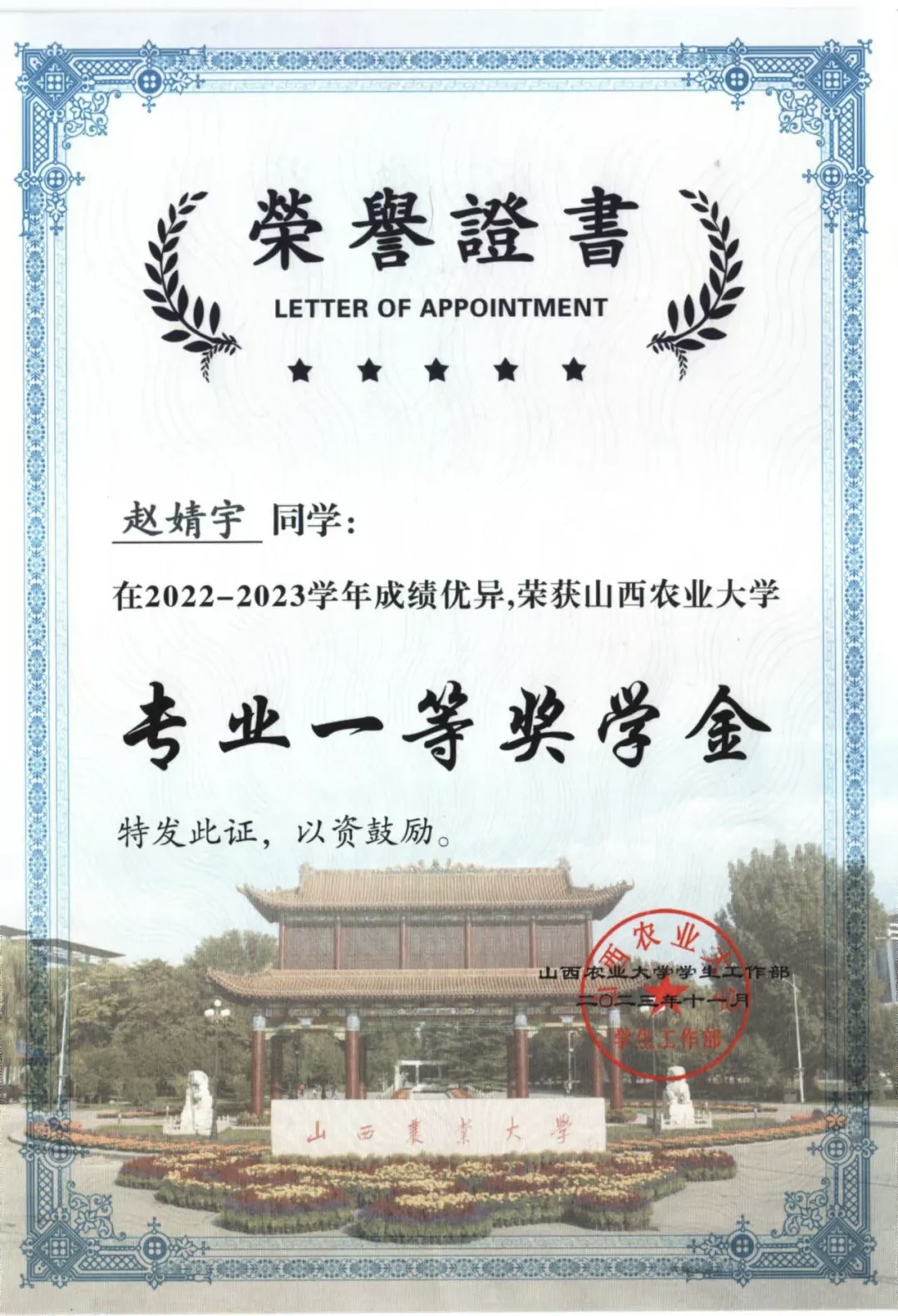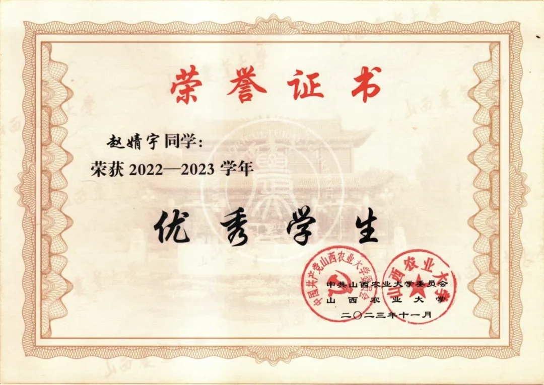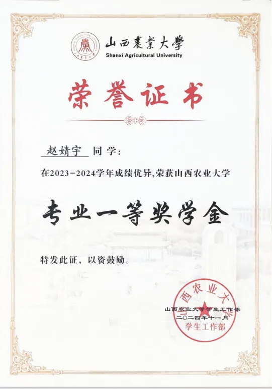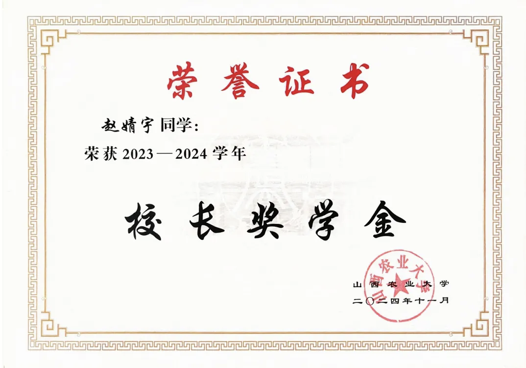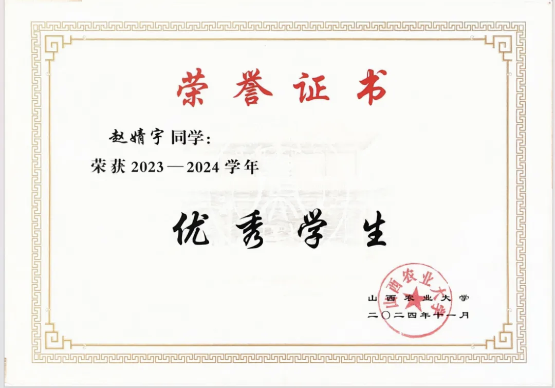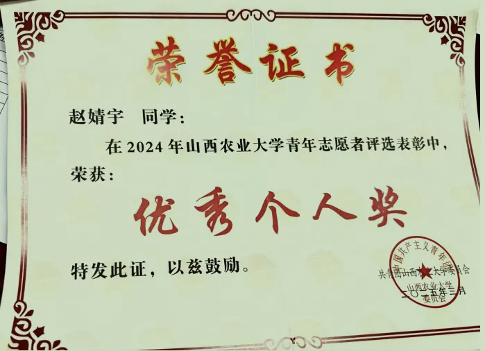 2025年:山西农业大学志愿者优秀个人奖、校长奖学金、专业一等奖学金、“优秀学生”荣誉称号